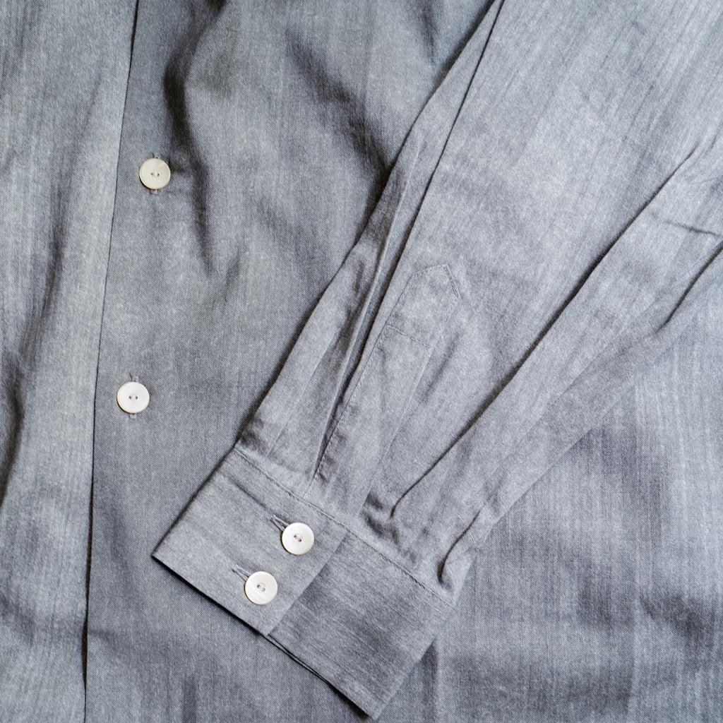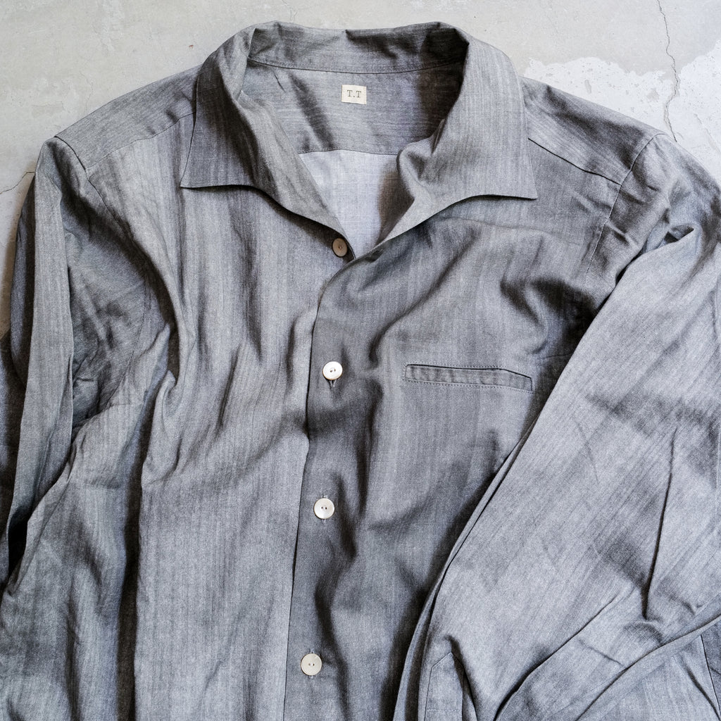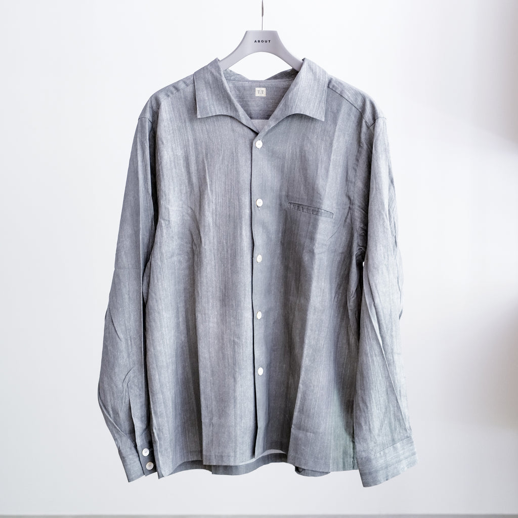オープンカラーシャツよりもカーブした開きが特徴のイタリアンカラーシャツ 京都の唐紙工房「かみそえ」が手がける墨によるマーブル模様にインスピレーションを得たユニークな柄 友禅染の職人による繊細な筆致のニュアンスを、オリジナルの絣柄コットンレーヨン生地に墨で手描きした1着