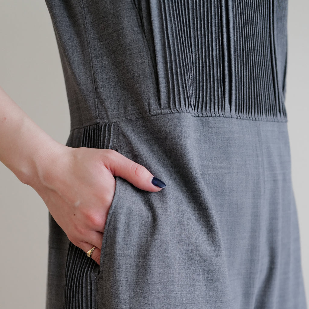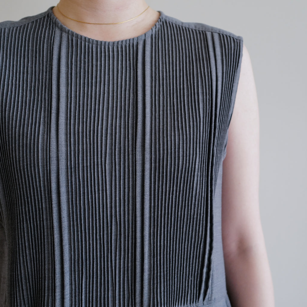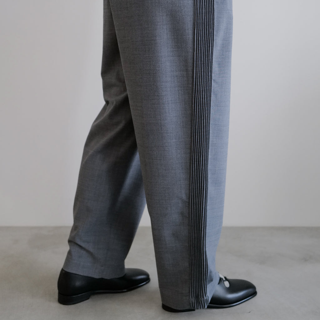 2026SSからスタートした新シリーズ"Bourke" ウールの梳毛糸に、リサイクルポリエステルとポリウレタンを混紡することにより、シワになりづらく、滑らかで伸縮性の高い着心地を実現 職人の手仕事によるピンタックも特徴