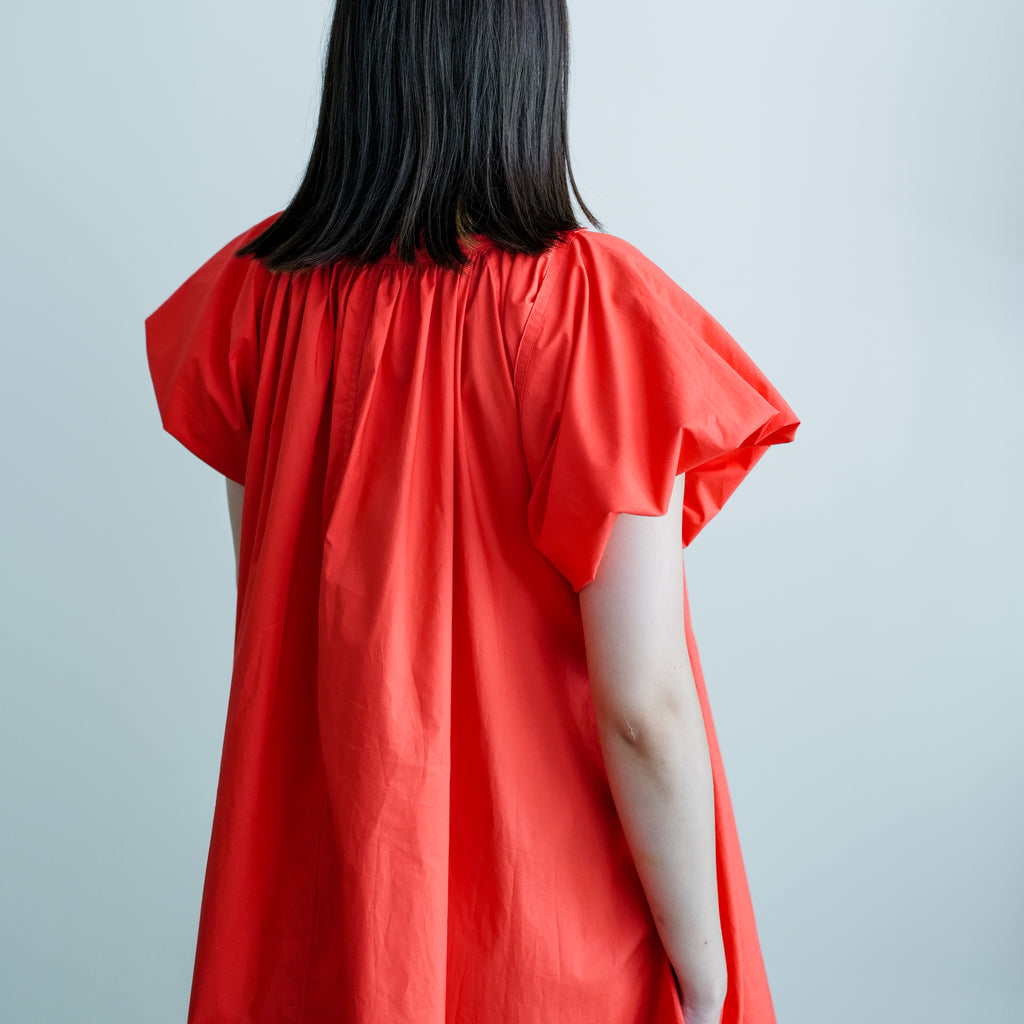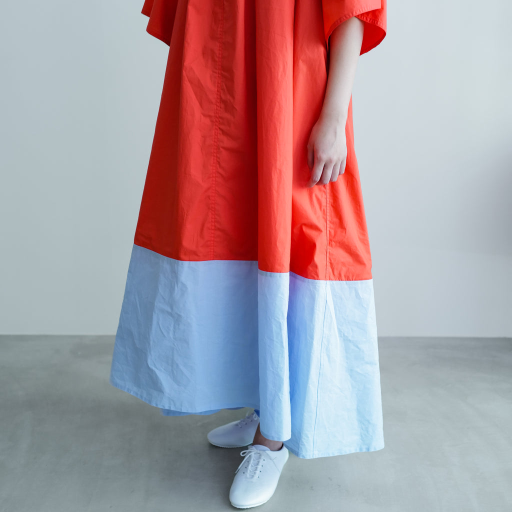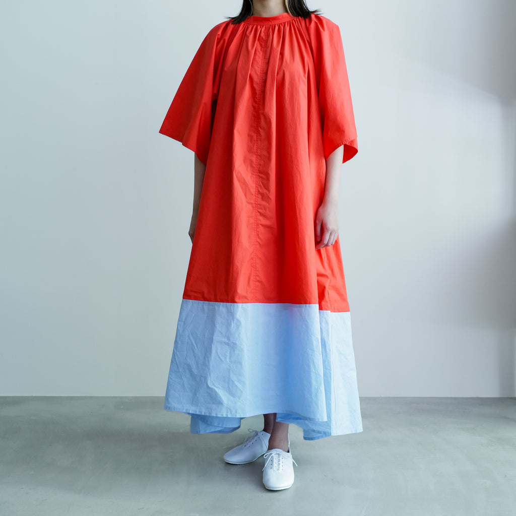 鮮やかな発色が特徴的なバイカラーのドレス ゆとりのあるサイズ感、裾にかけて広がるようなAラインシルエット 袖は折り返して留めることができ、気分によってアレンジが可能 質感の異なる2種のコットン生地を使用することで、シンプルながらも存在感のある仕上り