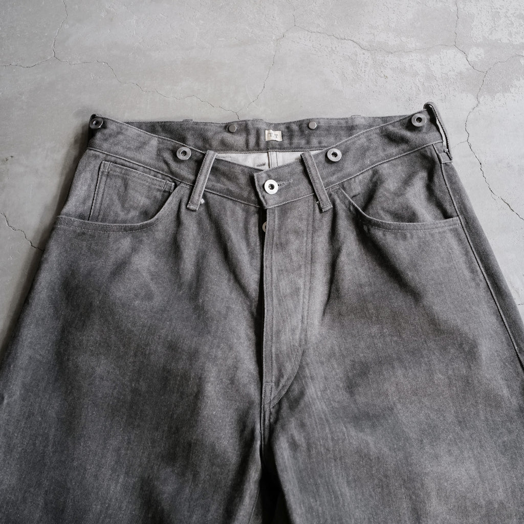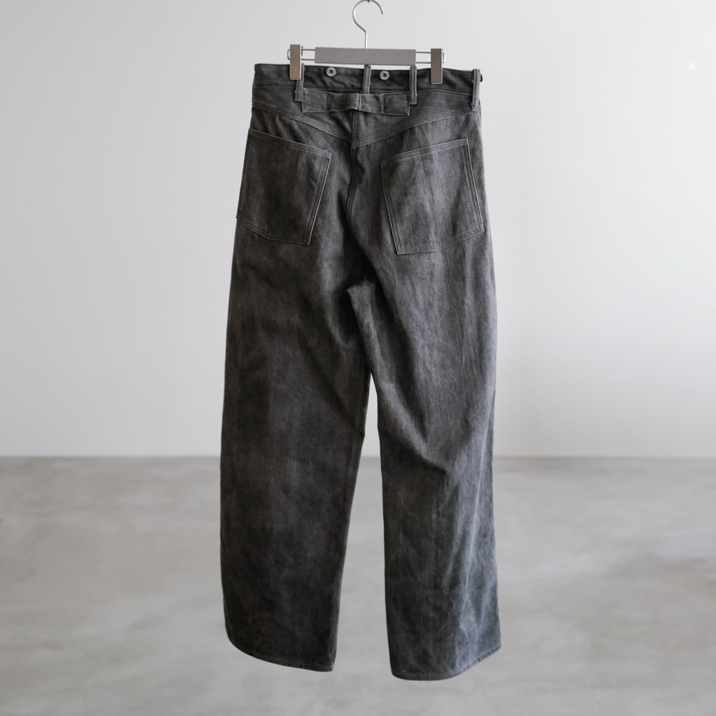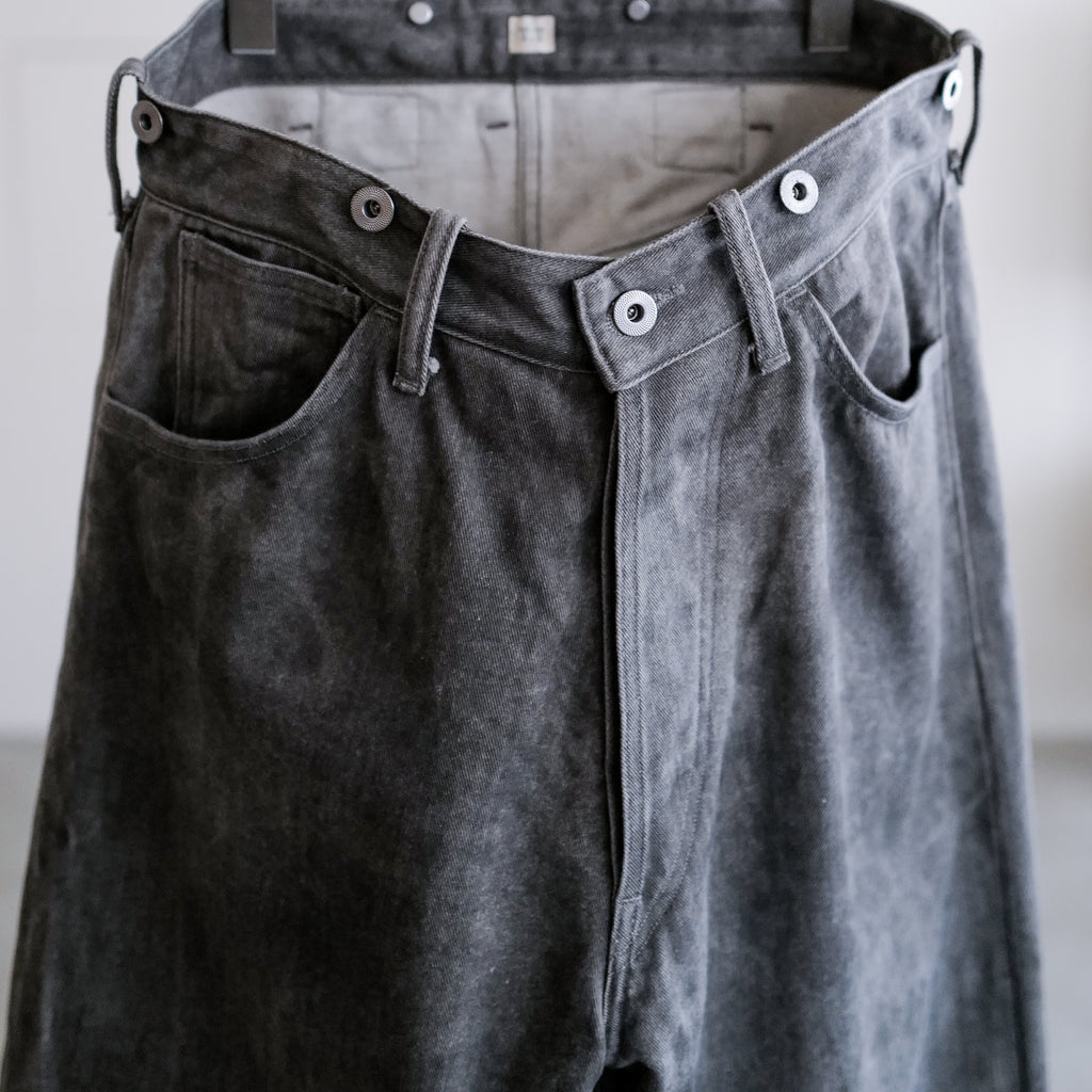 1920年代頃のデニムトラウザーズをベースにしたトラウザーズ 木炭で製品染めとダメージ加工を施した、古着特有の自然なシワやヒゲなど、着古したような風合いを表現 オリジナルのボタンやパーツは全て鉄製で、経年変化による美しい風合いを楽しめる