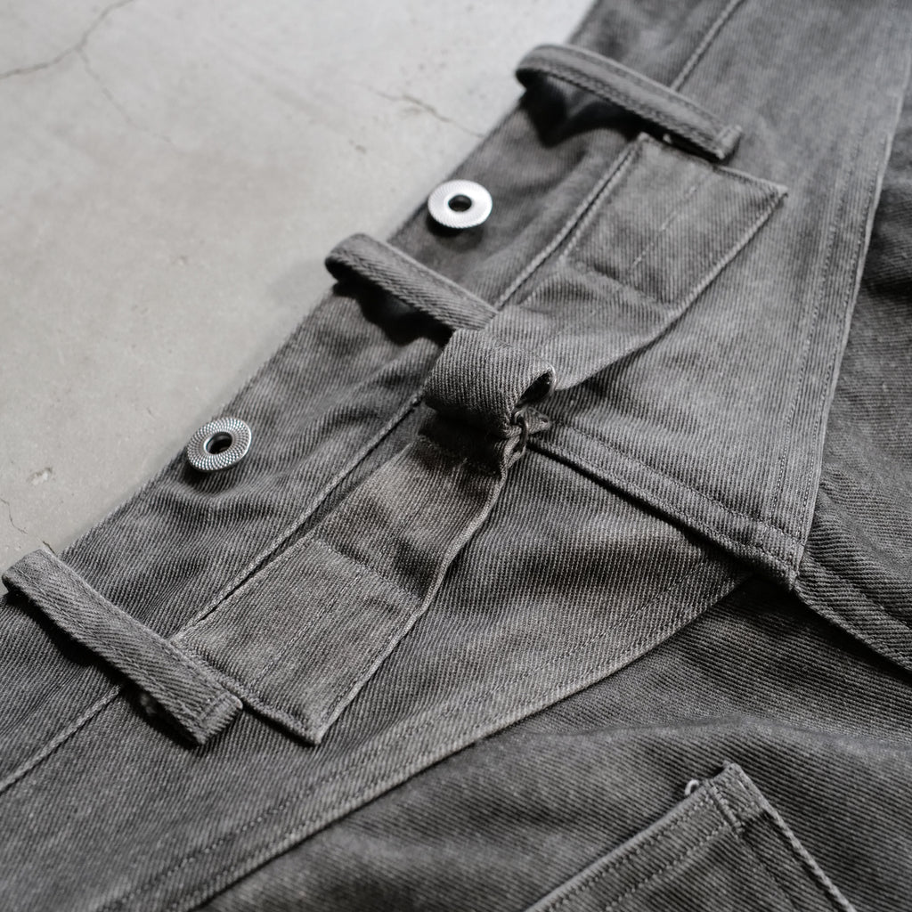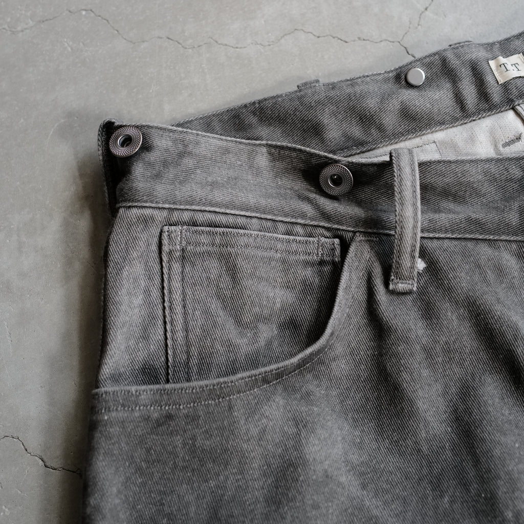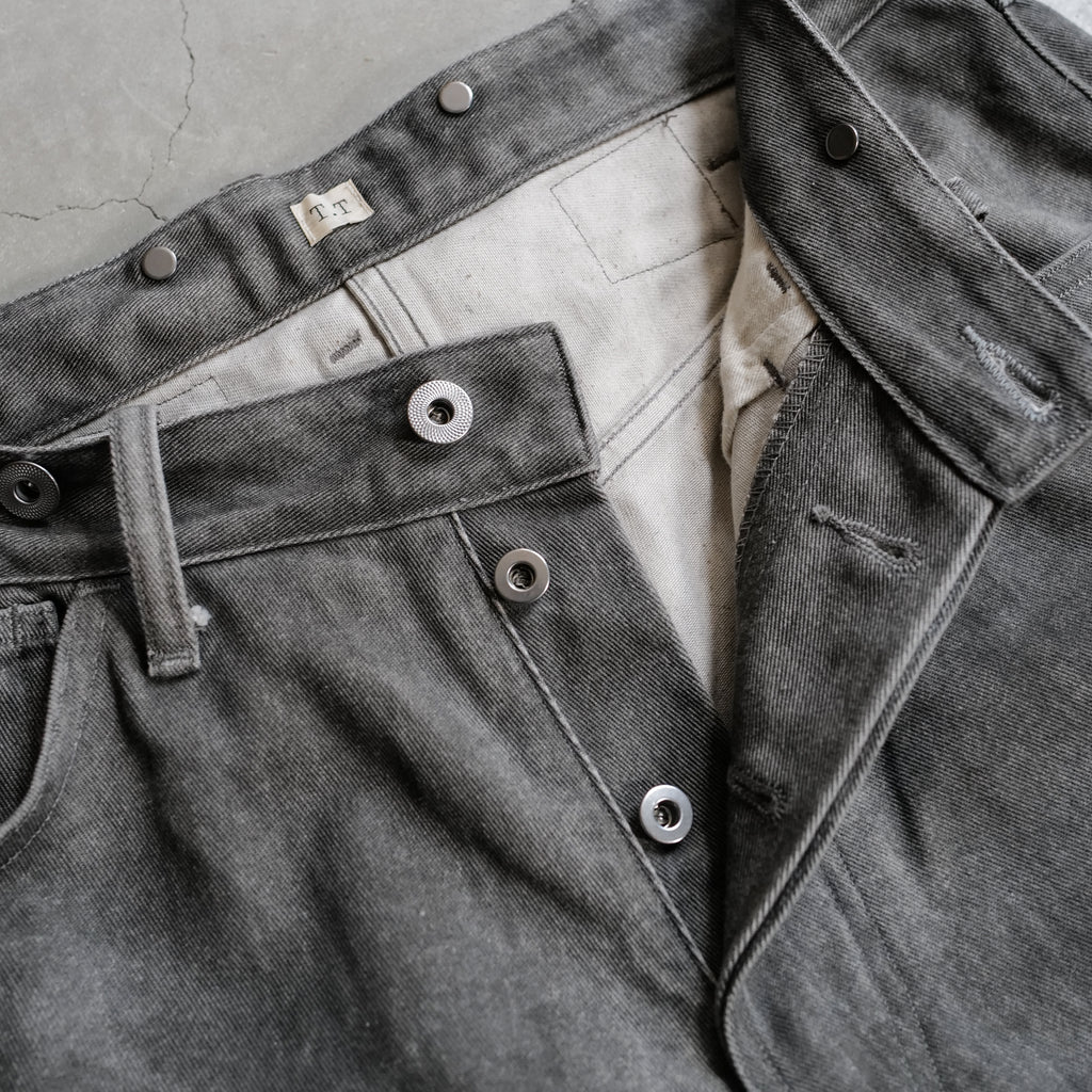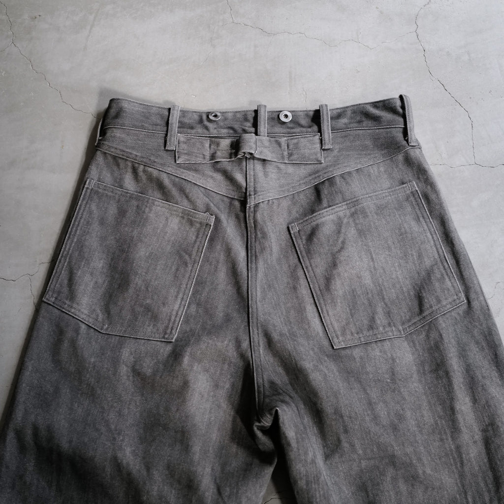 1920年代頃のデニムトラウザーズをベースにしたトラウザーズ 木炭で製品染めとダメージ加工を施した、古着特有の自然なシワやヒゲなど、着古したような風合いを表現 オリジナルのボタンやパーツは全て鉄製で、経年変化による美しい風合いを楽しめる
