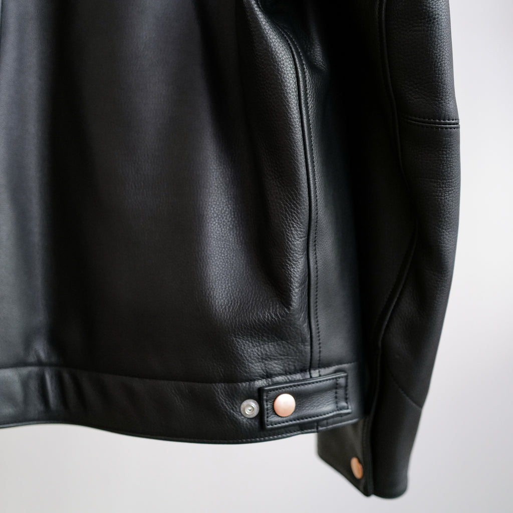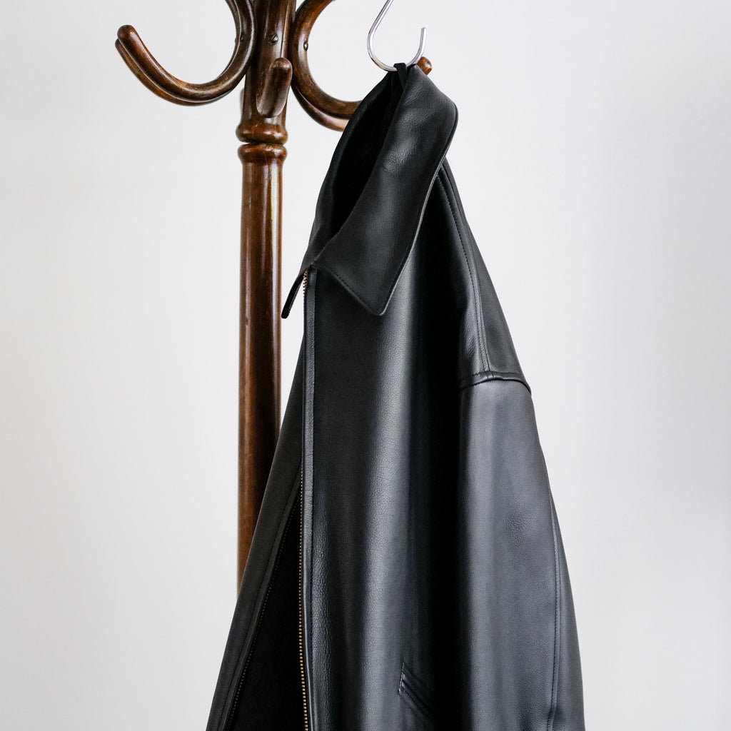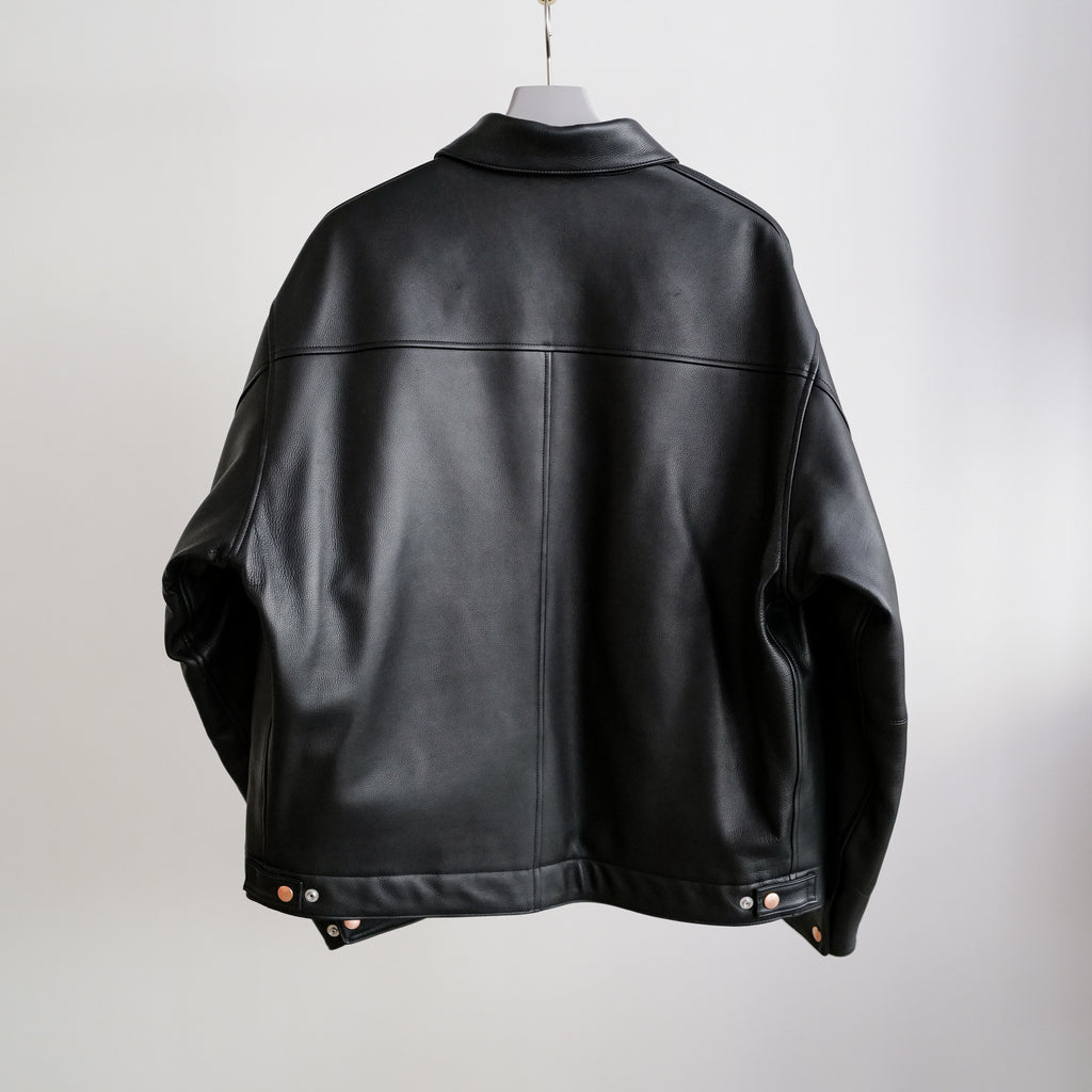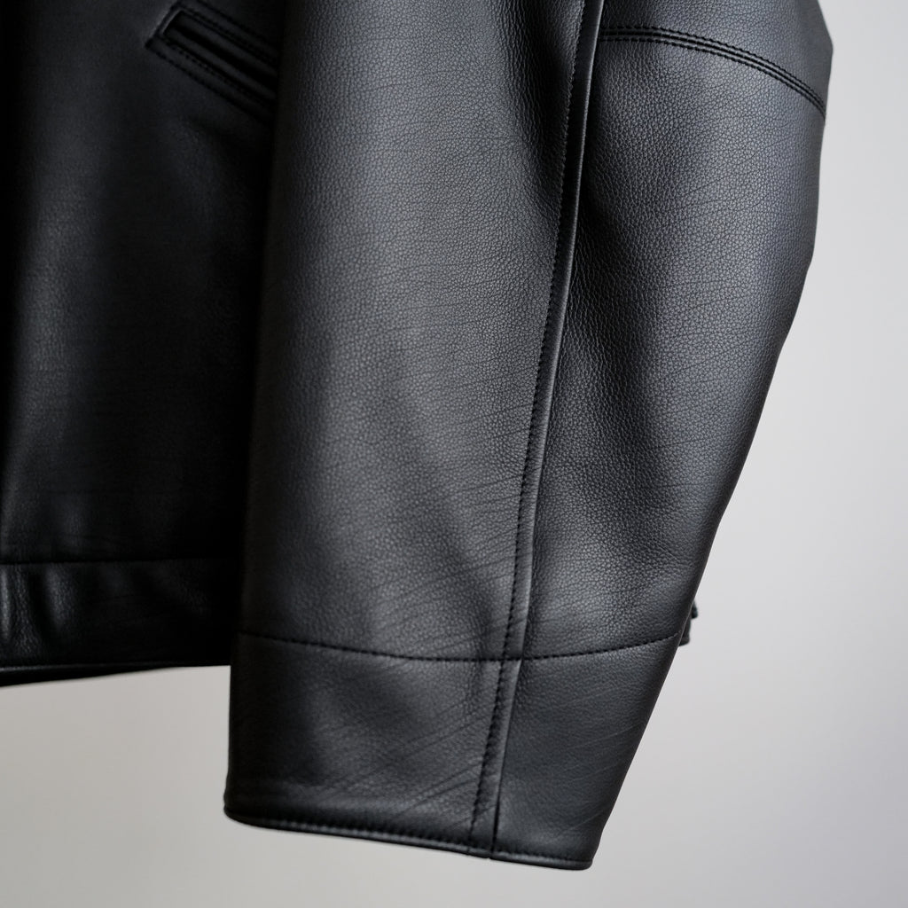 シンプルなデザインのジップショートジャケット シボ感のある柔らかいカーフスキンを使用 丸みのあるゆったりとしたシルエットが特徴