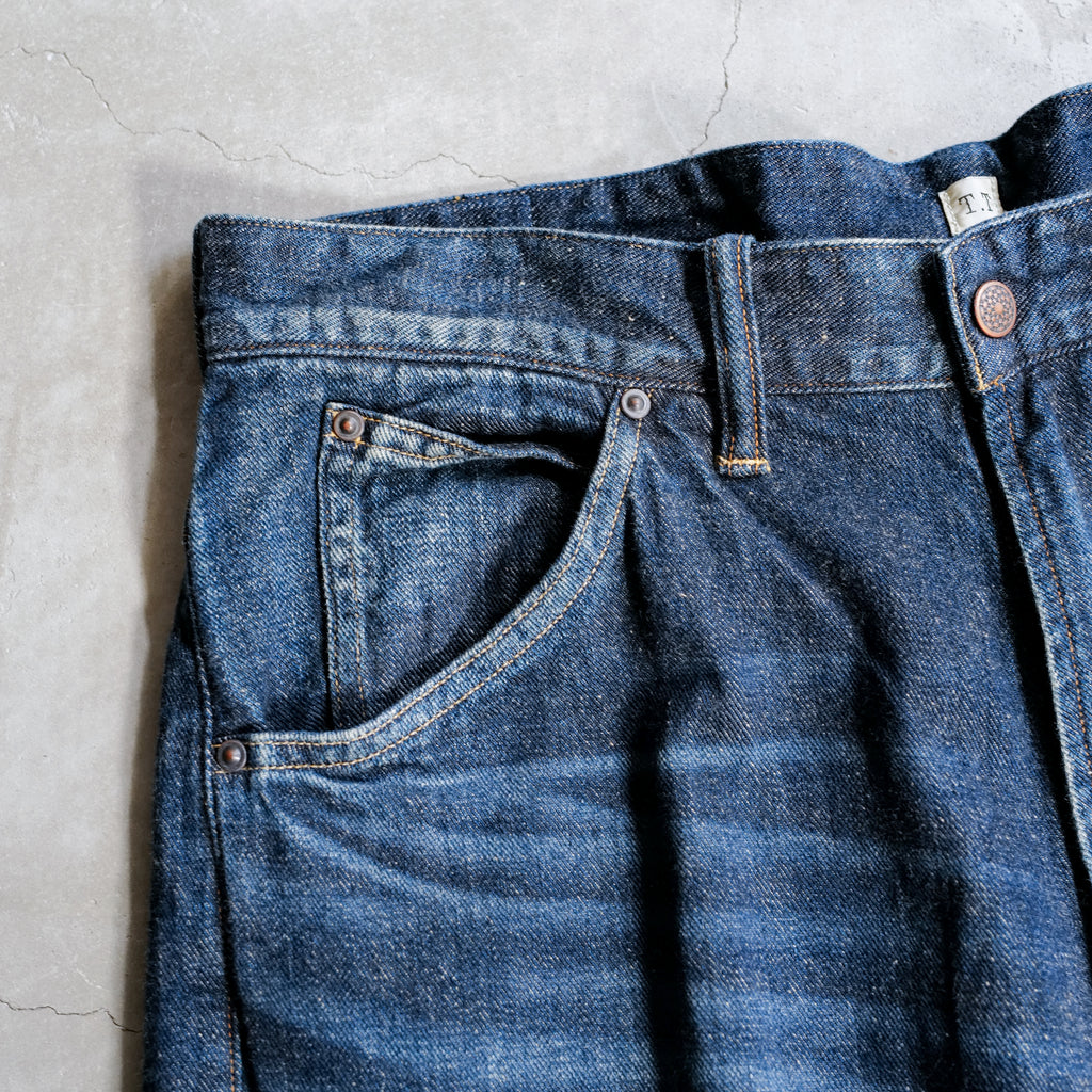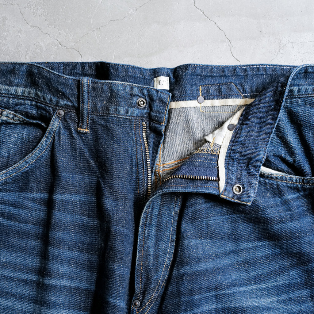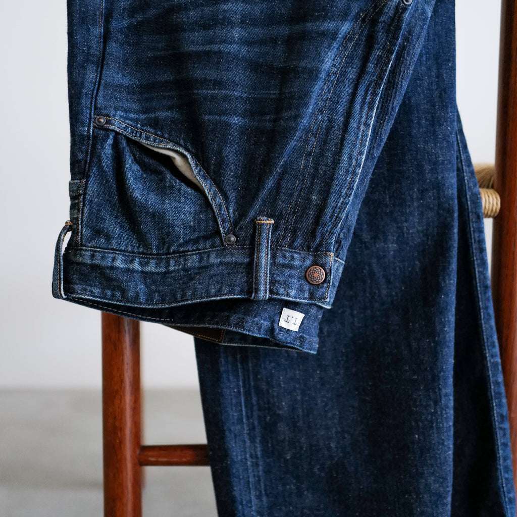 ブランドのシグネチャーであるデニムに、ダメージ加工を施したデニムトラウザー デットストック生地に何度も洗いをかけることによる、自然な色落ちと柔らかさを表現 レザーパッチは、奄美大島で泥染めを施した馬革を使用