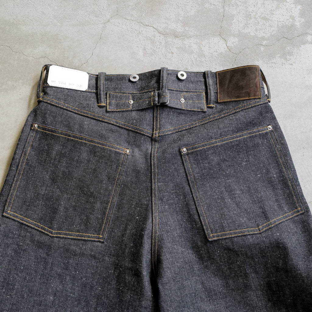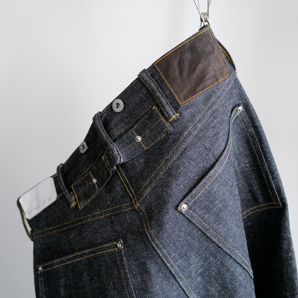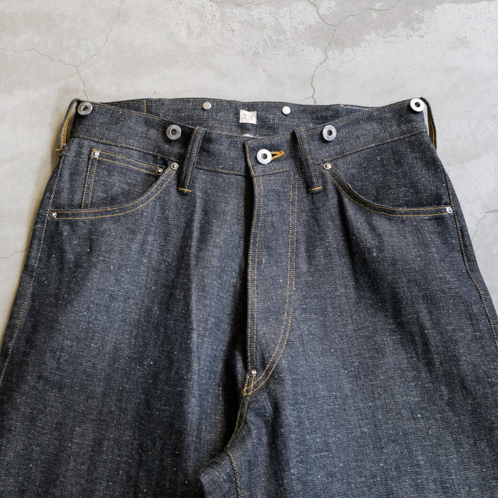 1920年代のデニムトラウザーズをベースにした1着 アメリカ産オーガニックコットン100%を使用し、岡山の旧式力織機で織り上げた3/1左綾のライトオンスデニム 綿糸本来のムラ感を残し、独特の緑がかったインディゴカラーが特徴