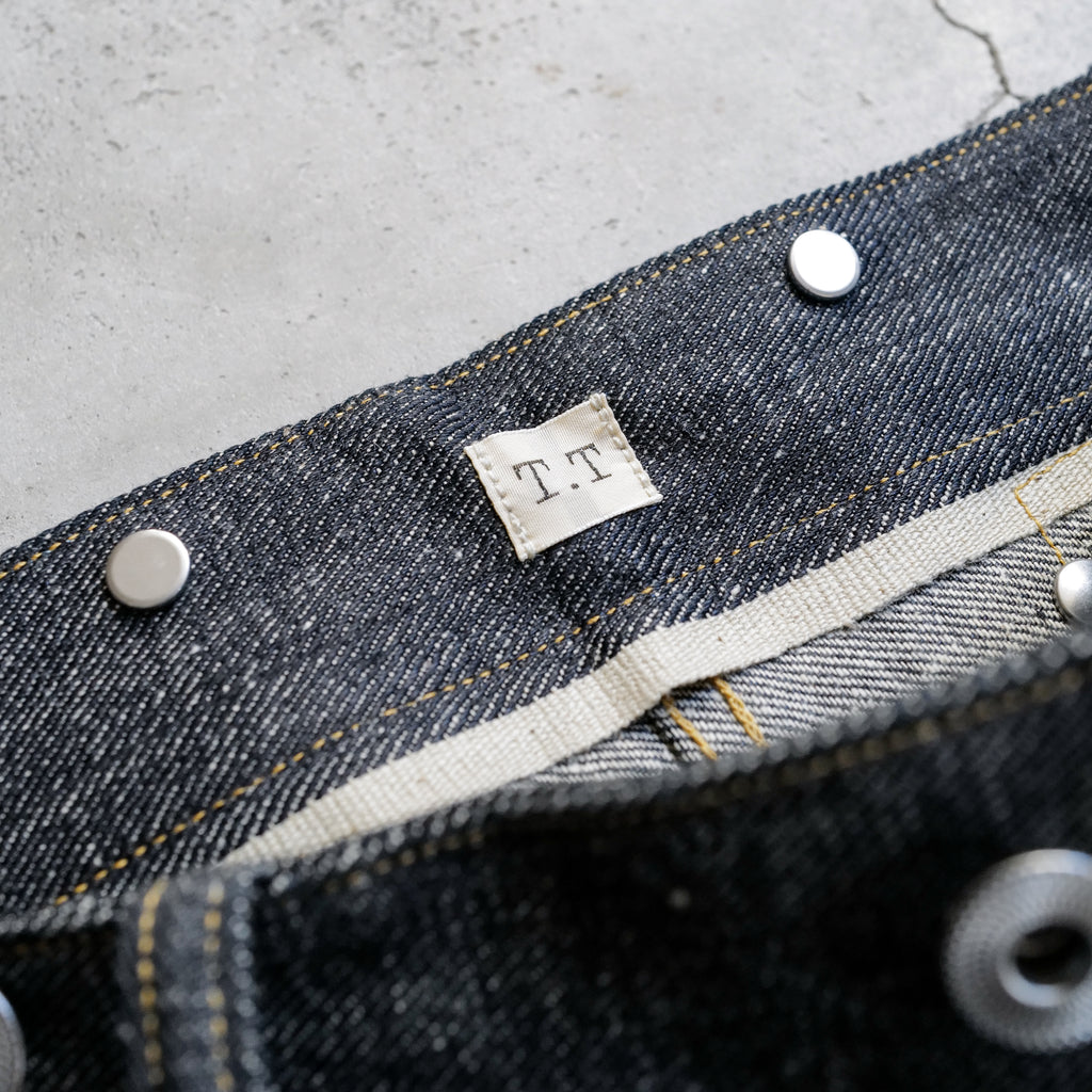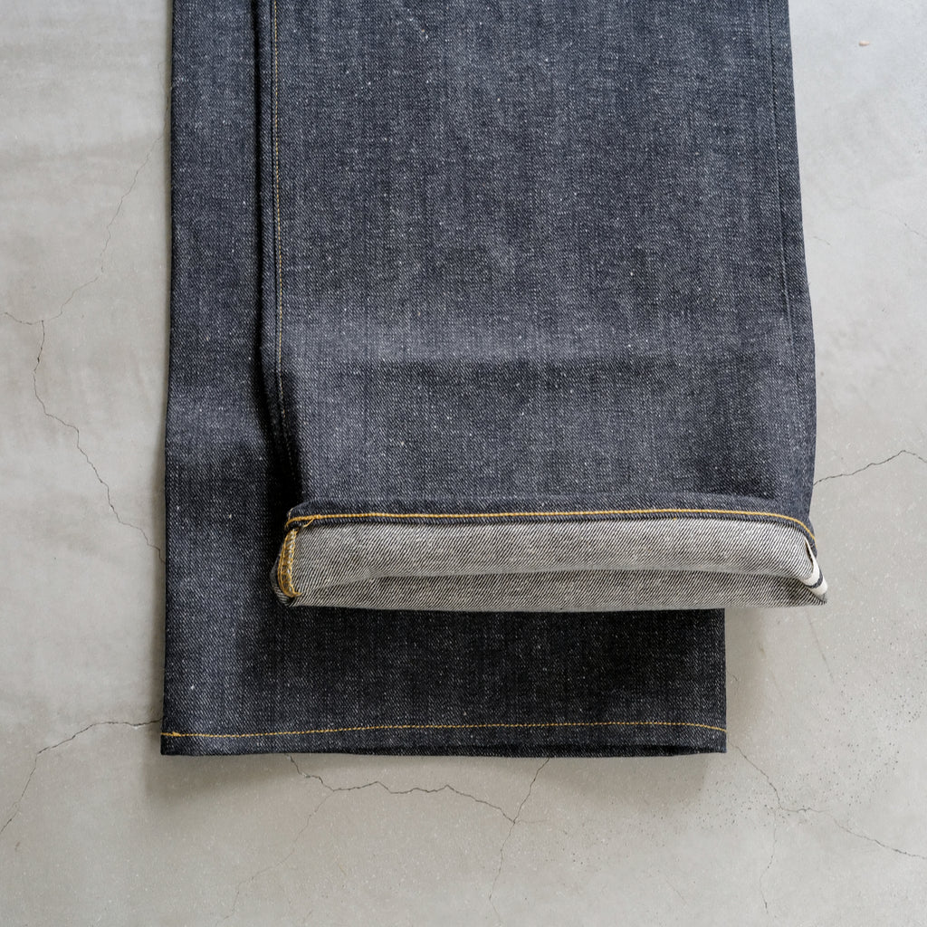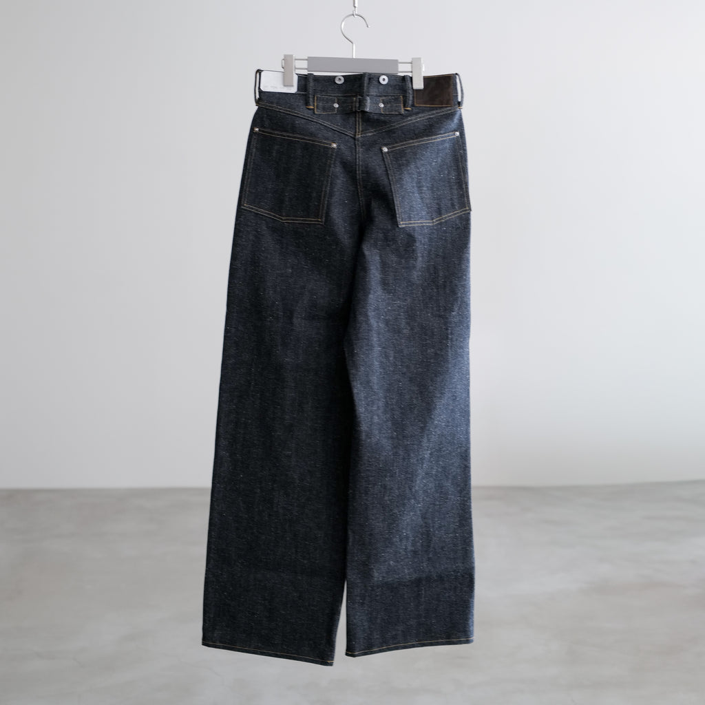 1920年代のデニムトラウザーズをベースにした1着 アメリカ産オーガニックコットン100%を使用し、岡山の旧式力織機で織り上げた3/1左綾のライトオンスデニム 綿糸本来のムラ感を残し、独特の緑がかったインディゴカラーが特徴