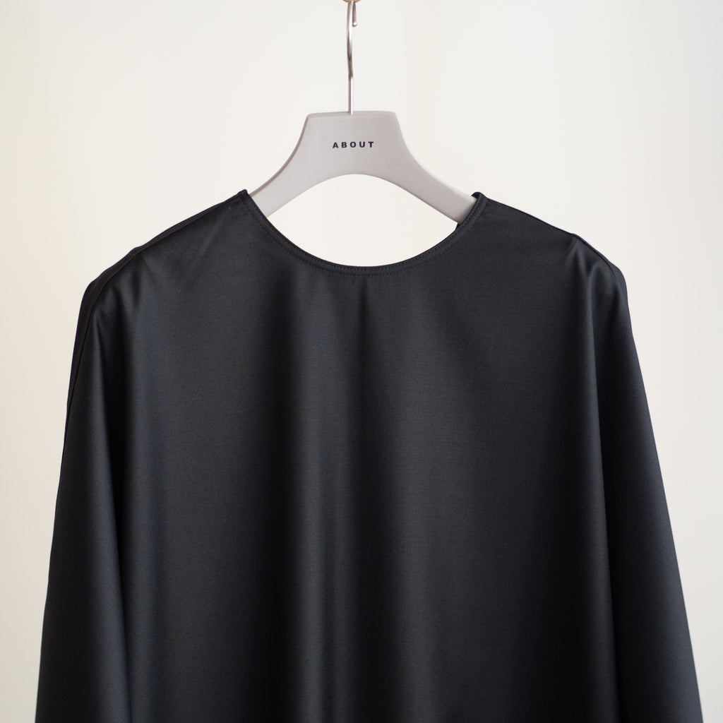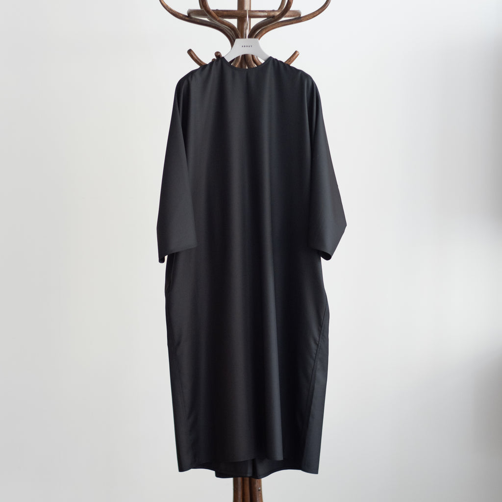 流れるようなカッティングを用いて作製されたドレス 背面は生地を残して縫製されており、ゆるやかに靡くドレープが特徴 サキソニー素材と呼ばれる、メリノウールを使用した薄くて柔らかな梳毛織りの生地