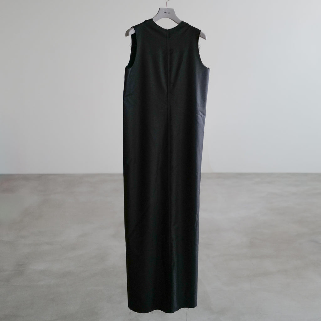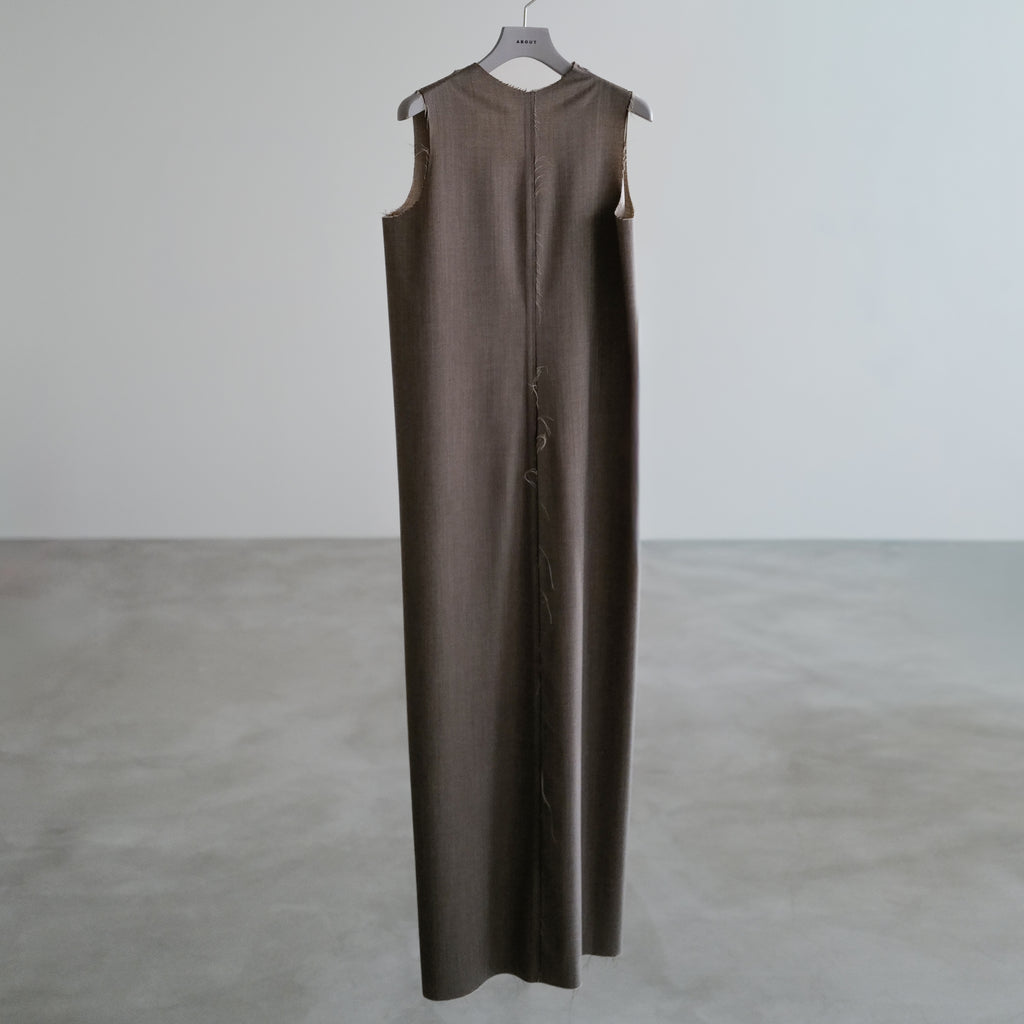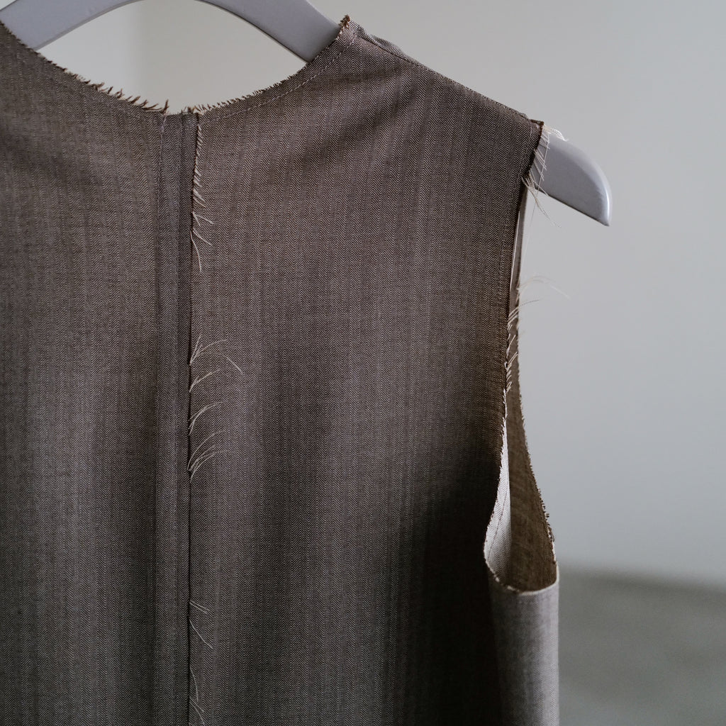 イタリアの老舗生地メーカーLoro Piana社のウール生地「HELIOS」を使用したノースリーブドレス 高い撥水性と細やかなヘリンボーン織り センターシーム、背面のカッティングが特徴