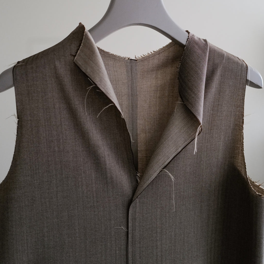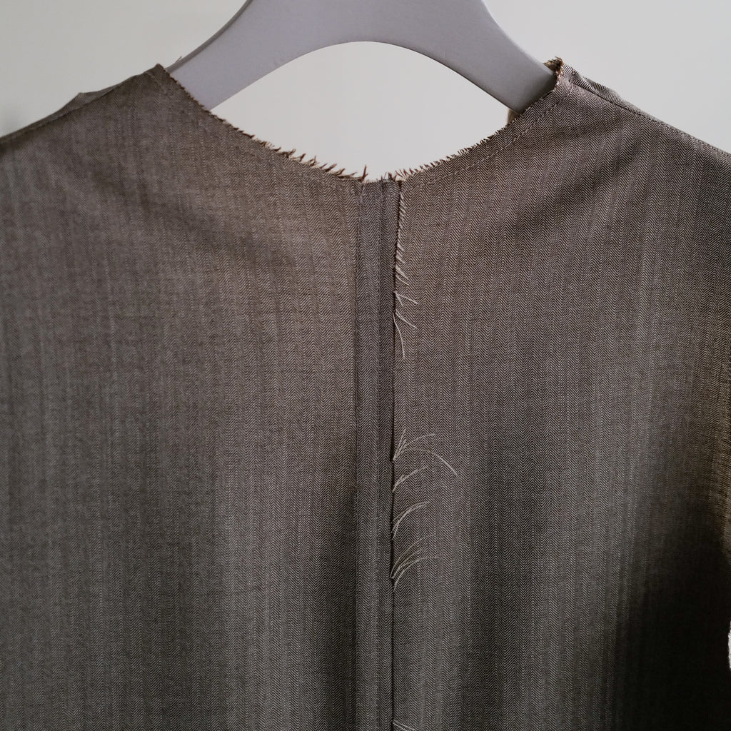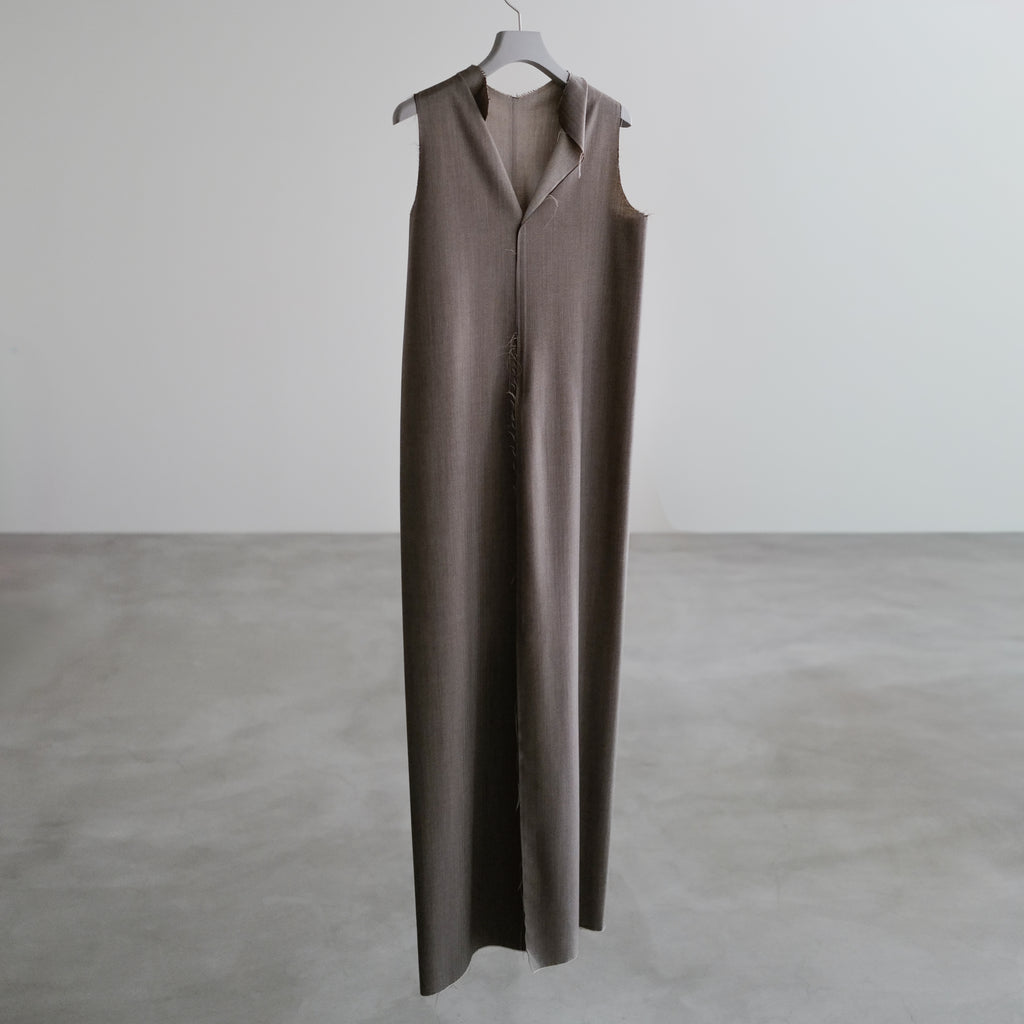 イタリアの老舗生地メーカーLoro Piana社のウール生地「HELIOS」を使用したノースリーブドレス 高い撥水性と細やかなヘリンボーン織り センターシーム、背面のカッティングが特徴