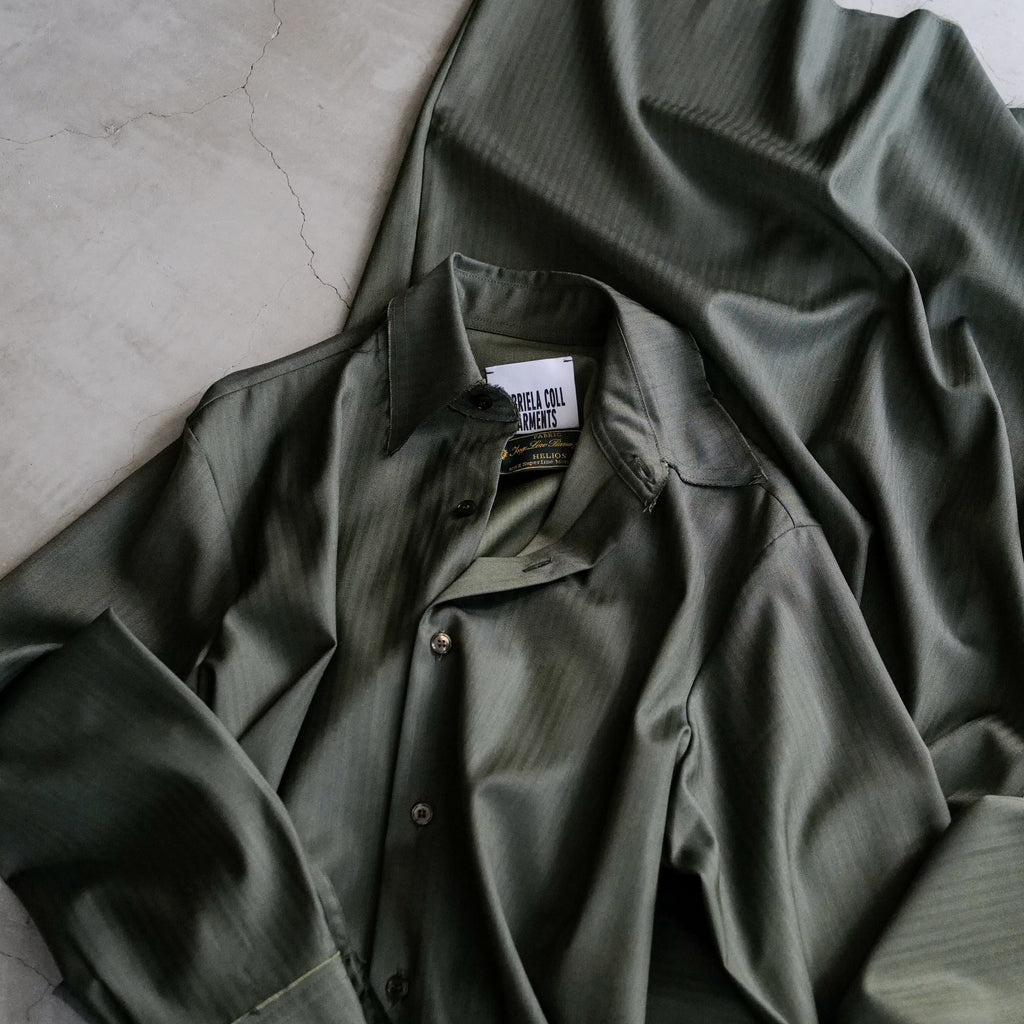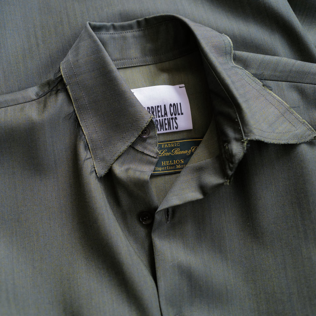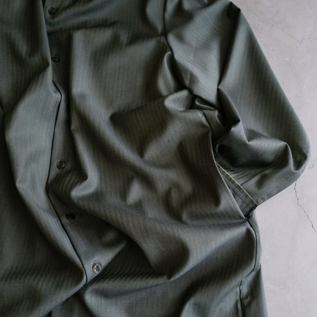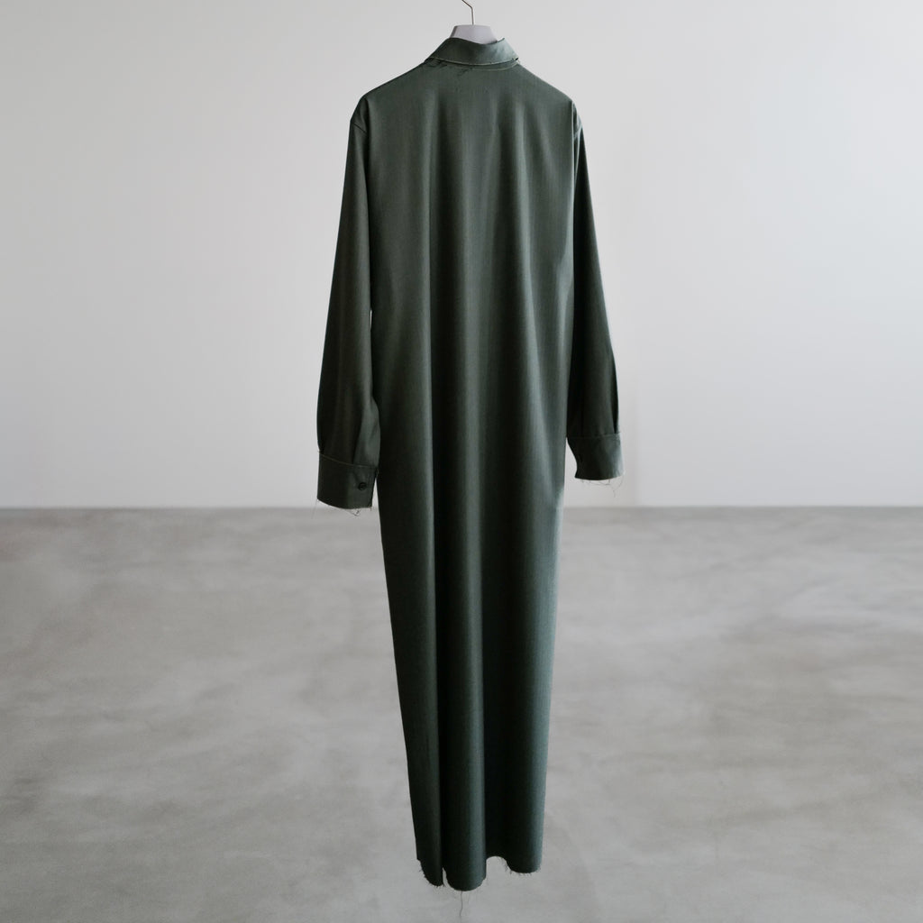 イタリアの老舗生地メーカーLoro Piana社のウール生地「HELIOS」を使用したロングスリーブドレス 高い撥水性と細やかなヘリンボーン織り 大きめの襟、やや縦長のすっきりしたシルエットが特徴