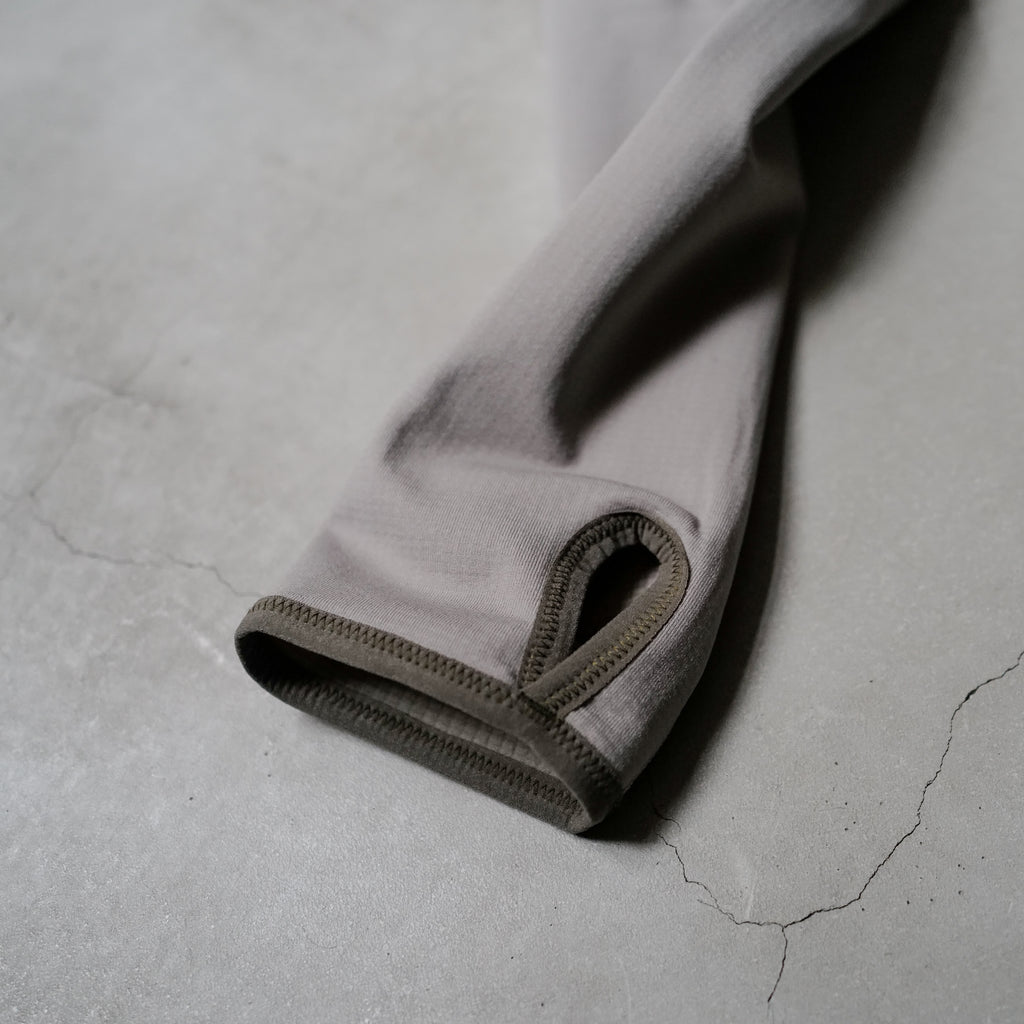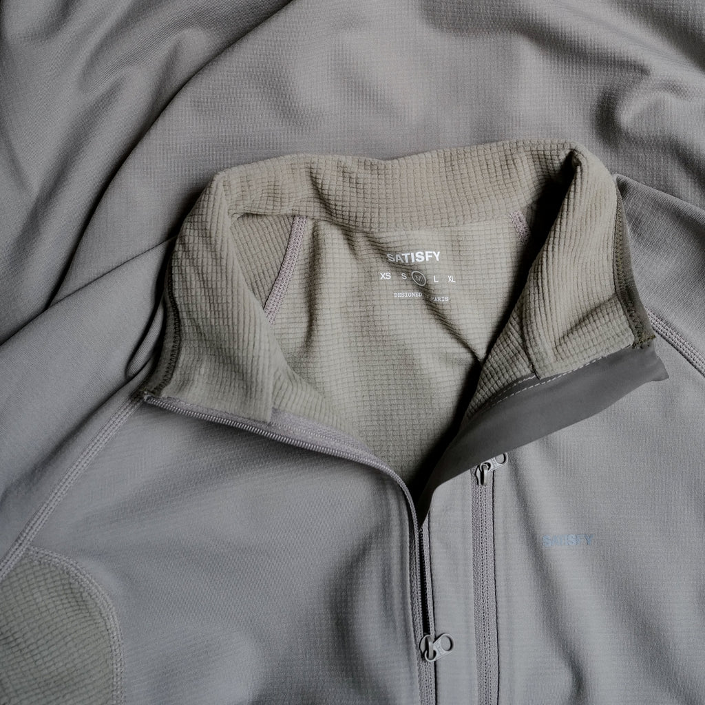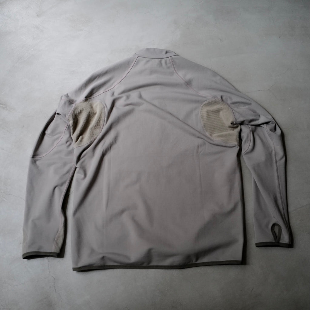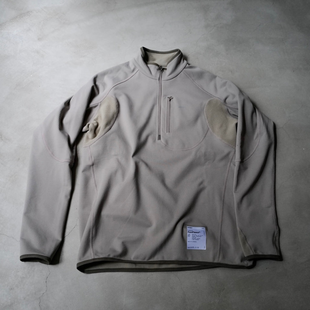 ハーフジップのフリースプルオーバー 軽量でありながら保温性を追求した二層構造ニット素材 裏地のグリッド構造が空気の流れを促し、熱を閉じ込めながら湿気を逃がす機能を持つ