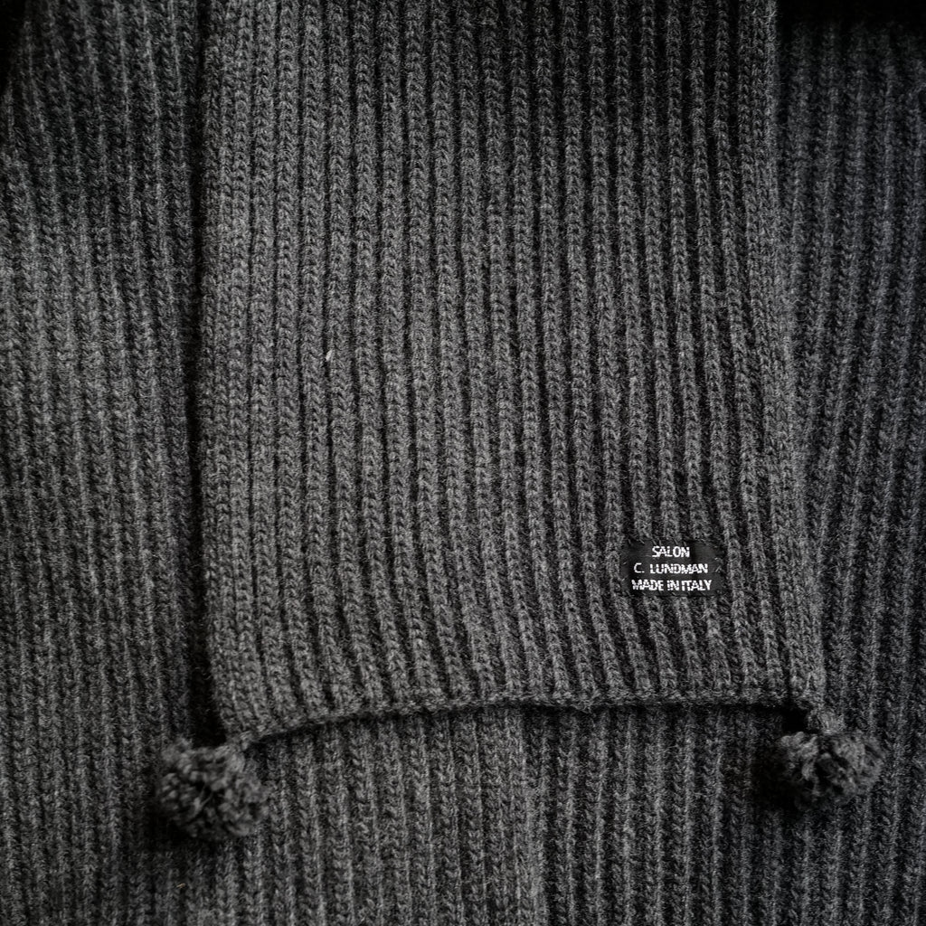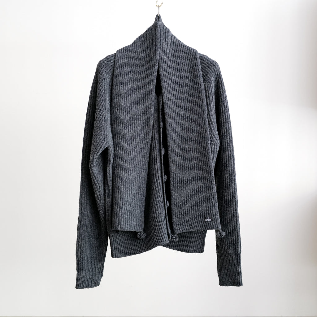 CHUNKY RIBBED CARDIGANと同じ糸を使用したスカーフ リブ編みによる柔らかな質感 四隅にタッセルがついたユニークなデザイン CHUNKY RIBBED CARDIGANと併せての着用もおすすめ