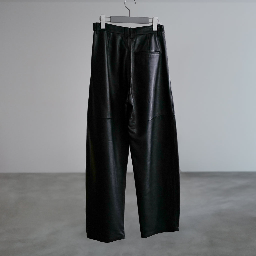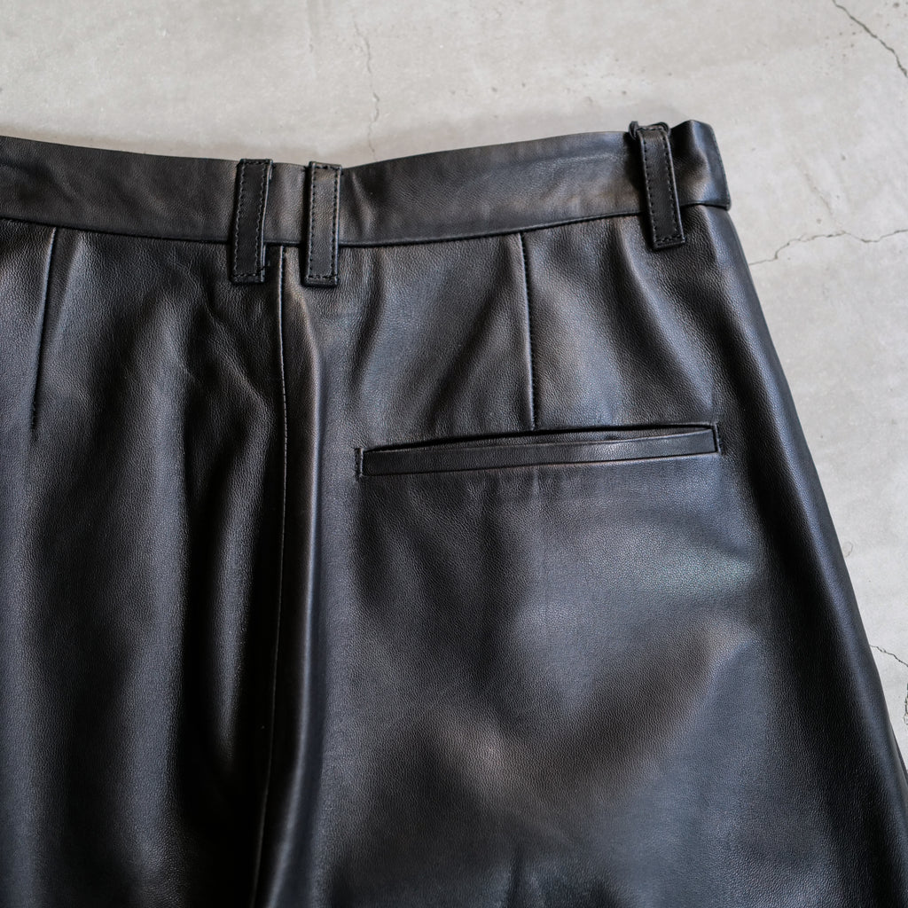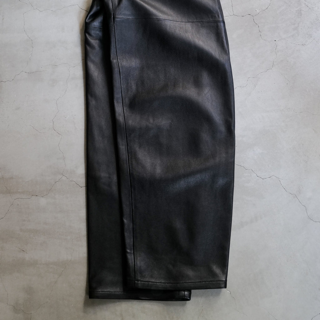 ラムレザーのワイドパンツ 軽さと柔らかさが特徴であるナッパラン加工を施した、上質なラムレザーを使用 通常の革よりも柔らかさと、水や汚れに強い撥水性・防汚性が向上