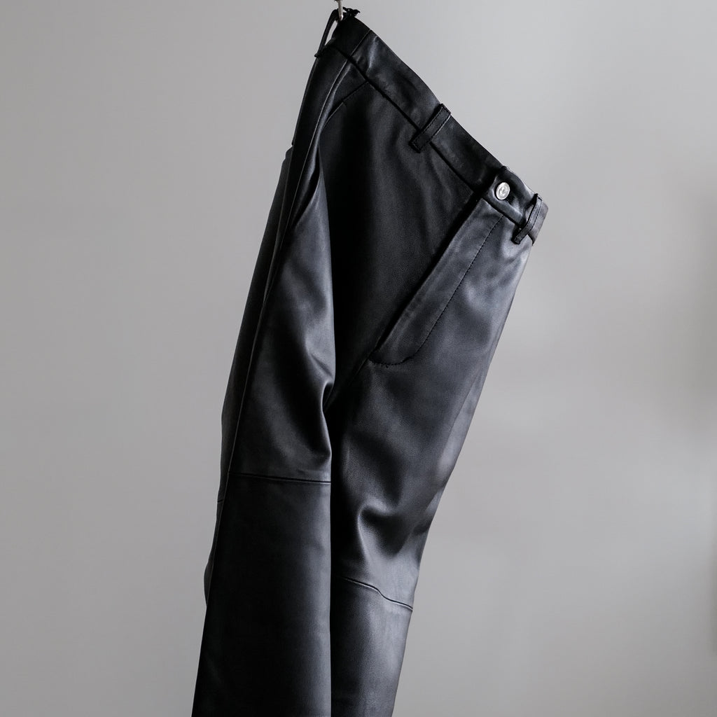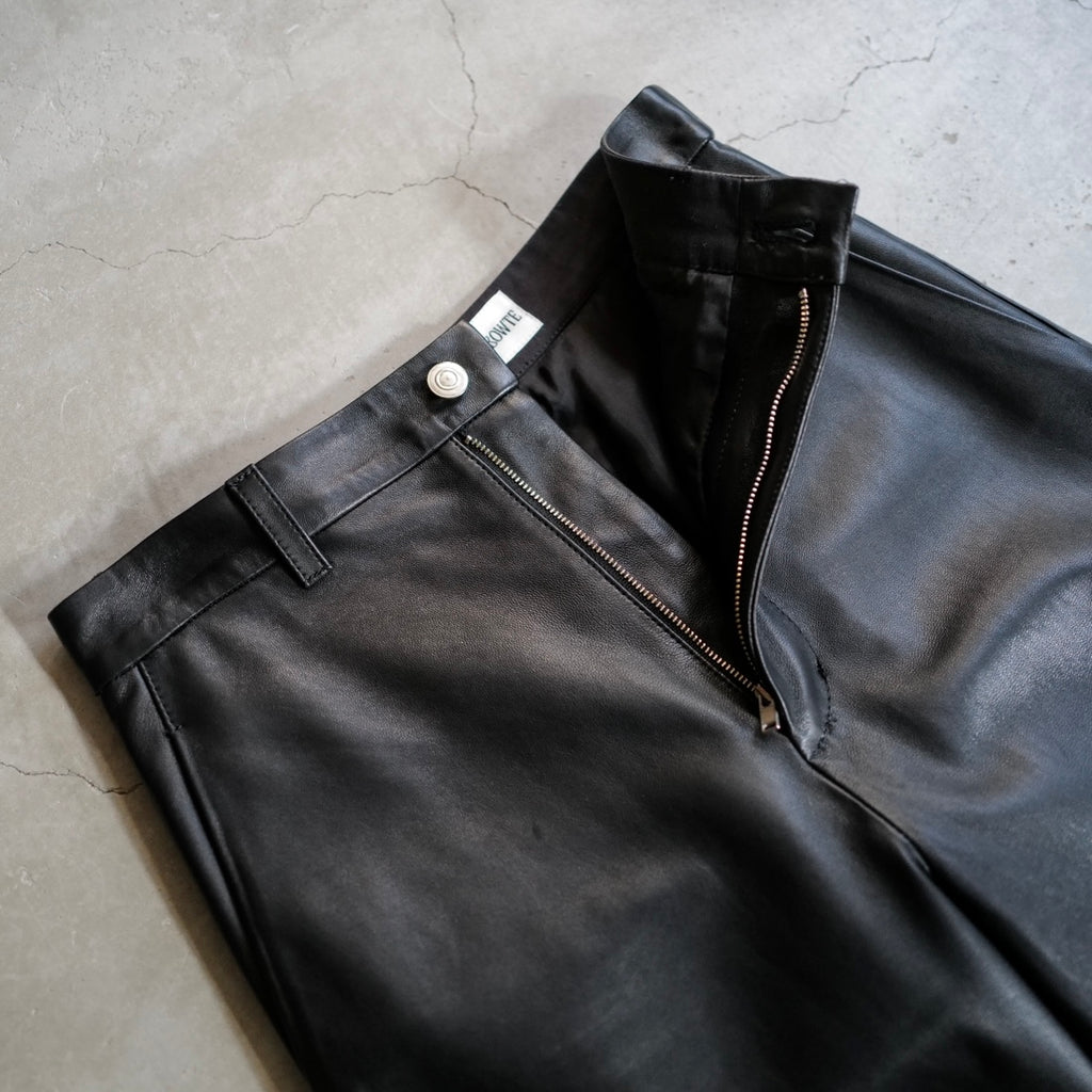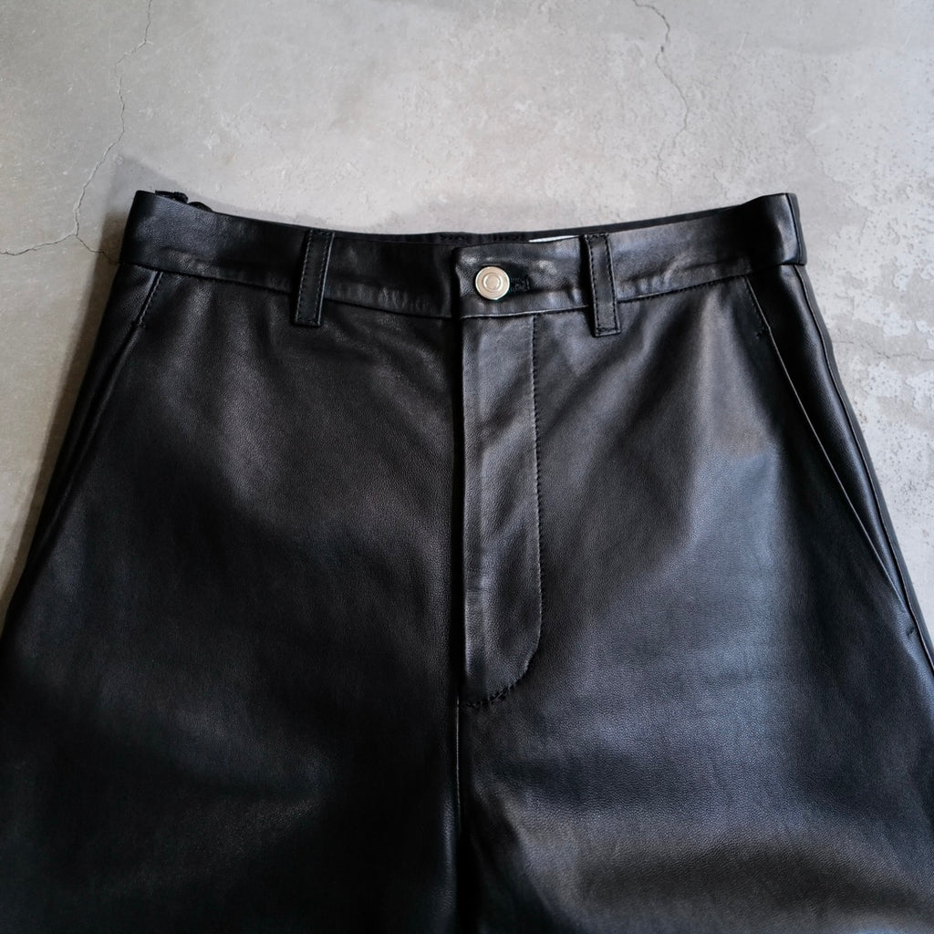 ラムレザーのワイドパンツ 軽さと柔らかさが特徴であるナッパラン加工を施した、上質なラムレザーを使用 通常の革よりも柔らかさと、水や汚れに強い撥水性・防汚性が向上