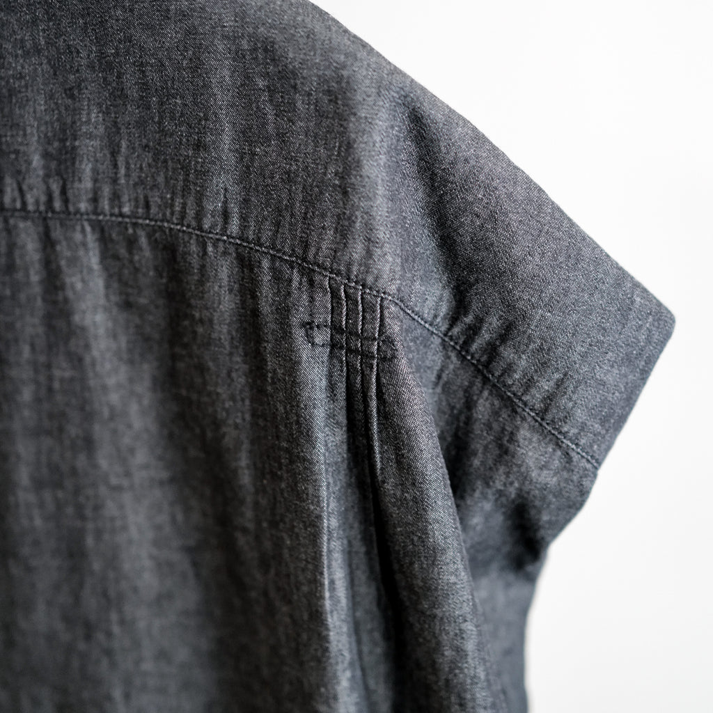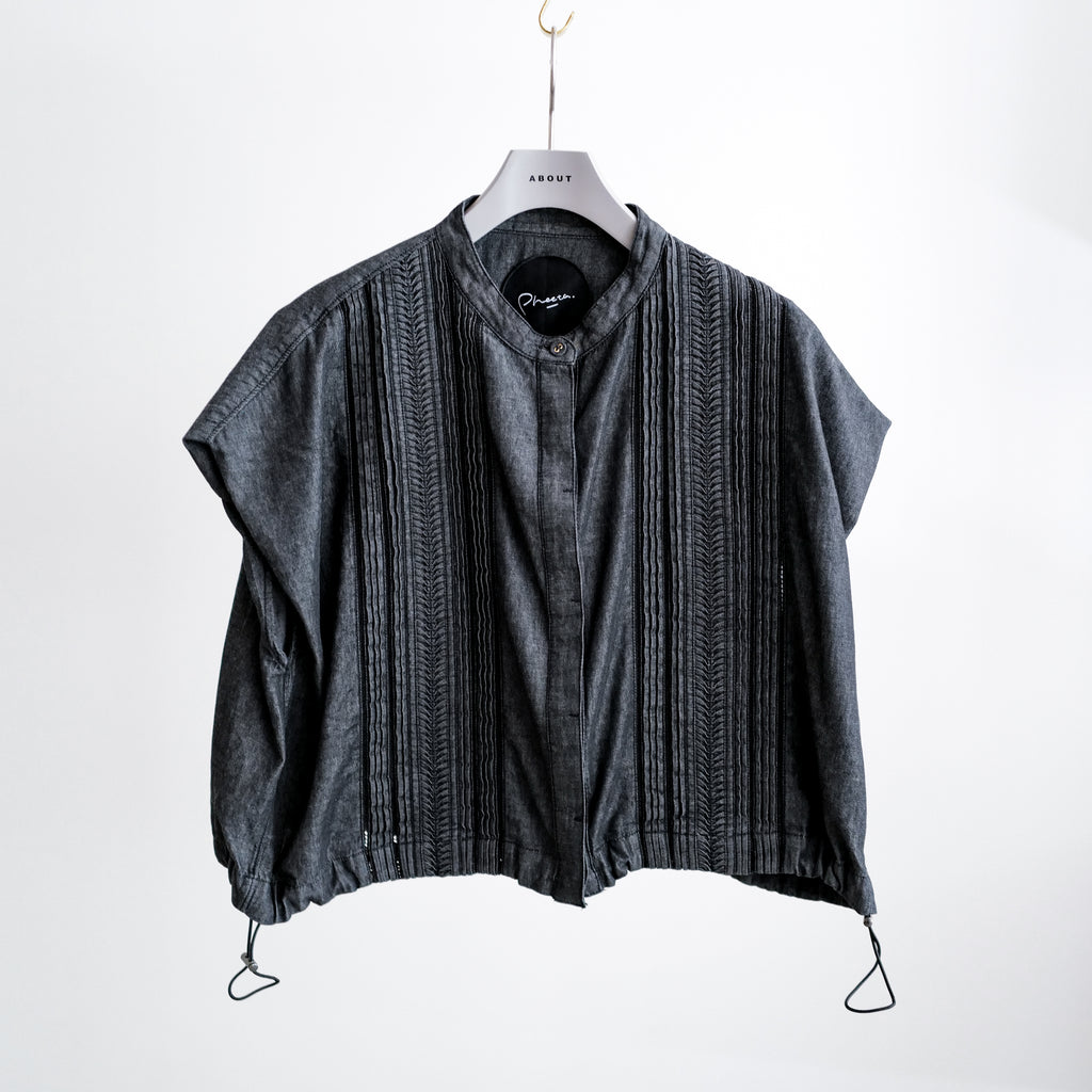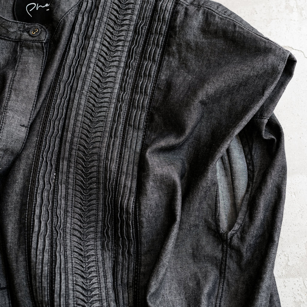 1stコレクションから続く定番シリーズ「Trinity」 ブザムシャツと呼ばれるメンズのドレスシャツを、現代の日常に組み入れたシリーズ 太番手のオーガニックコットンを使用し、製品洗い加工を加えることで、より奥行きのある表情に仕上げた 手仕事による細かなピンタック 着丈を短くカットし、裾にドローコードを配したデザイン