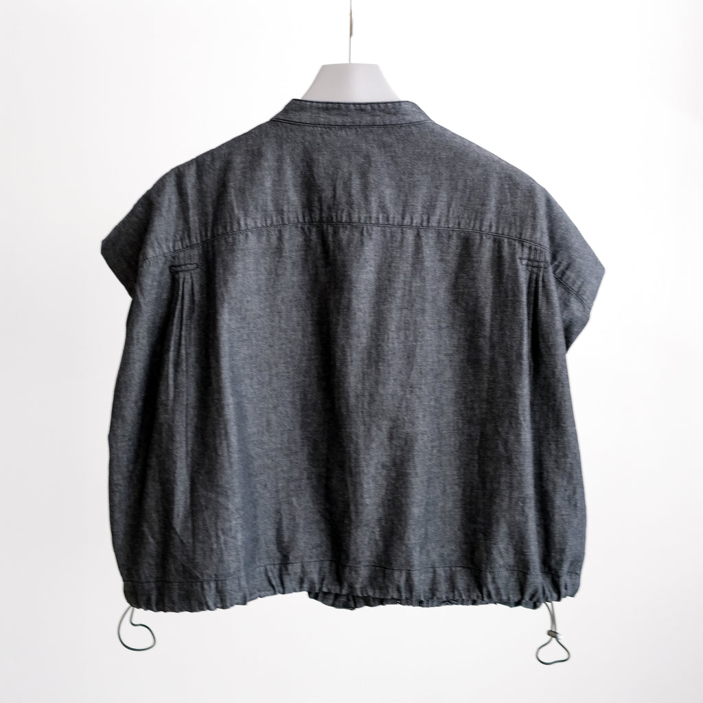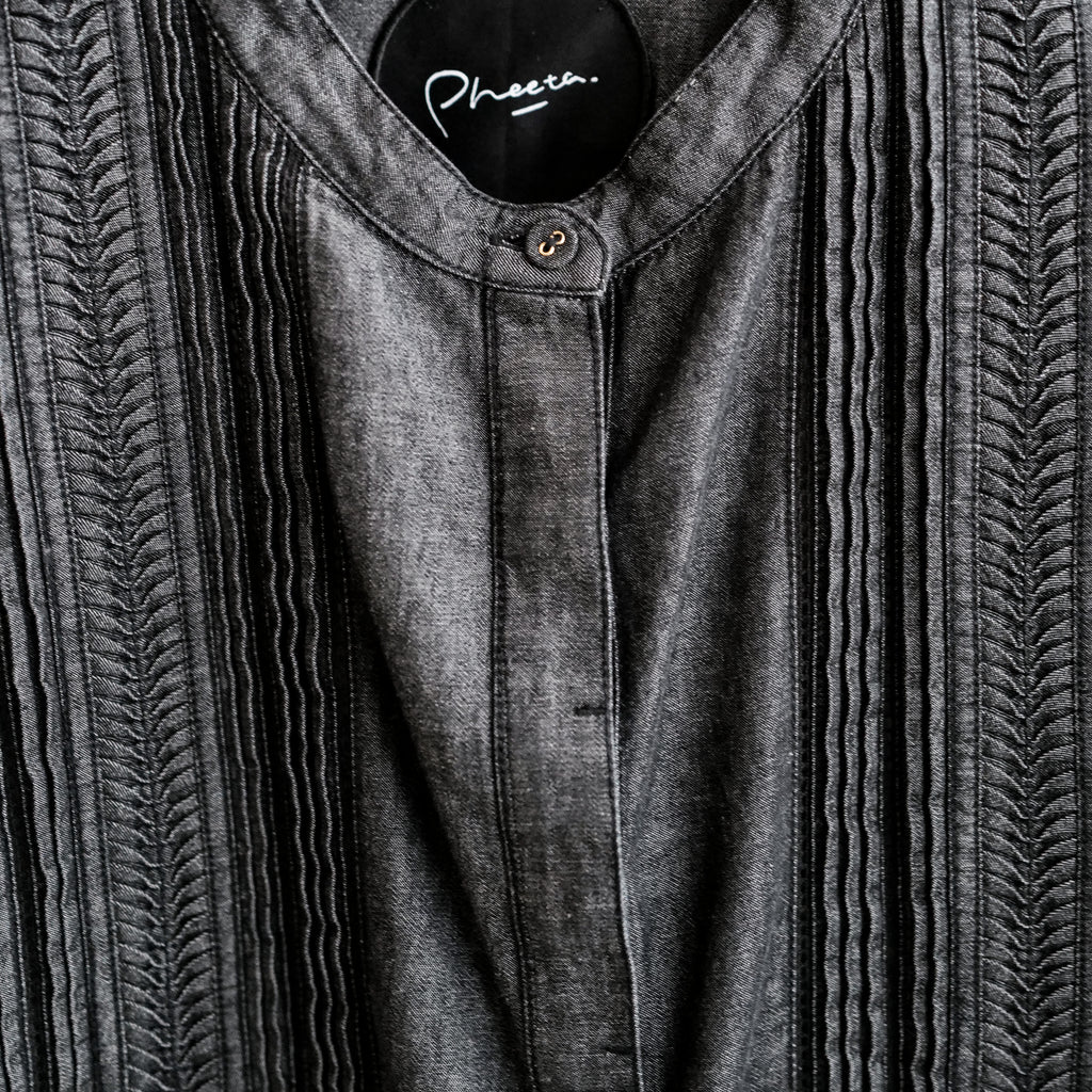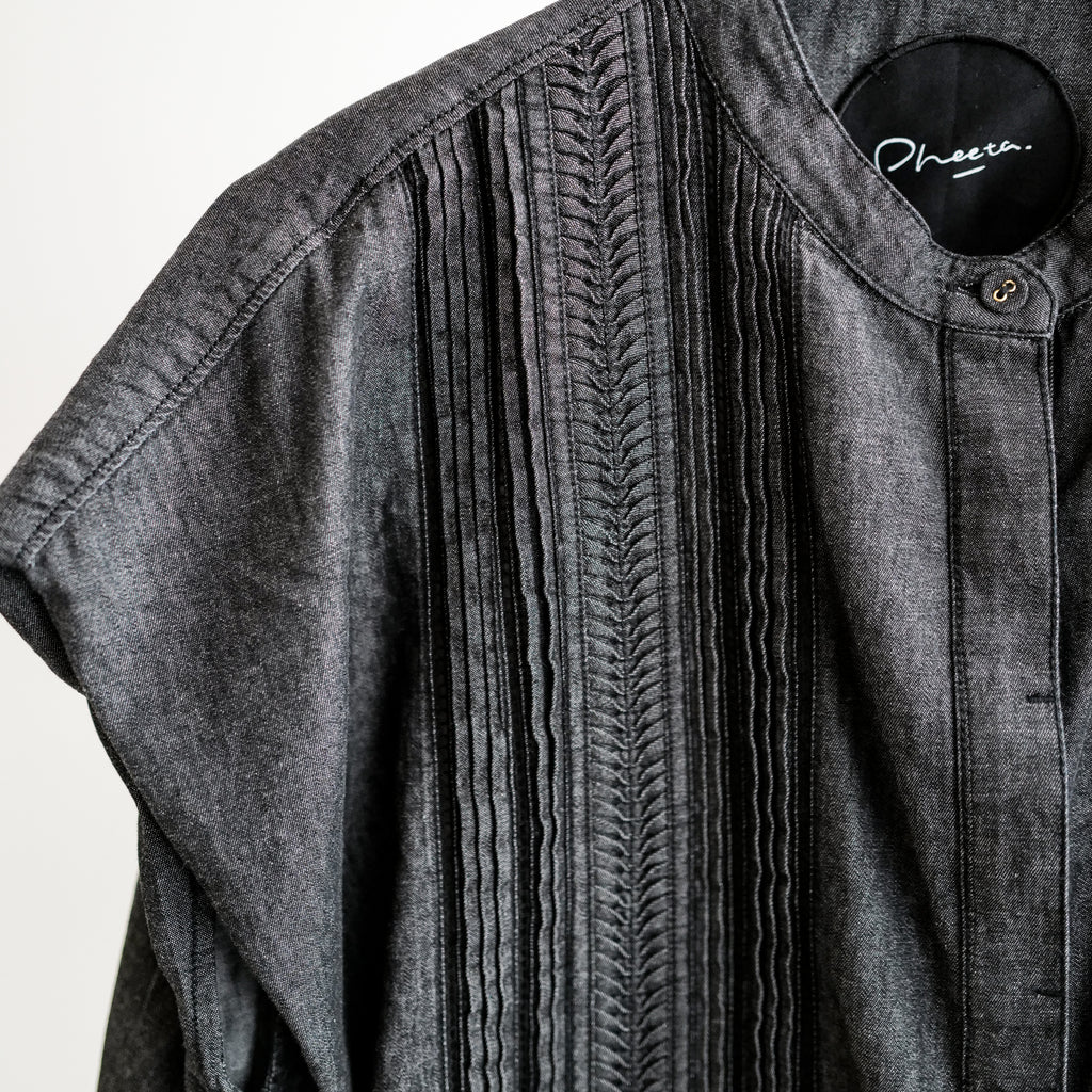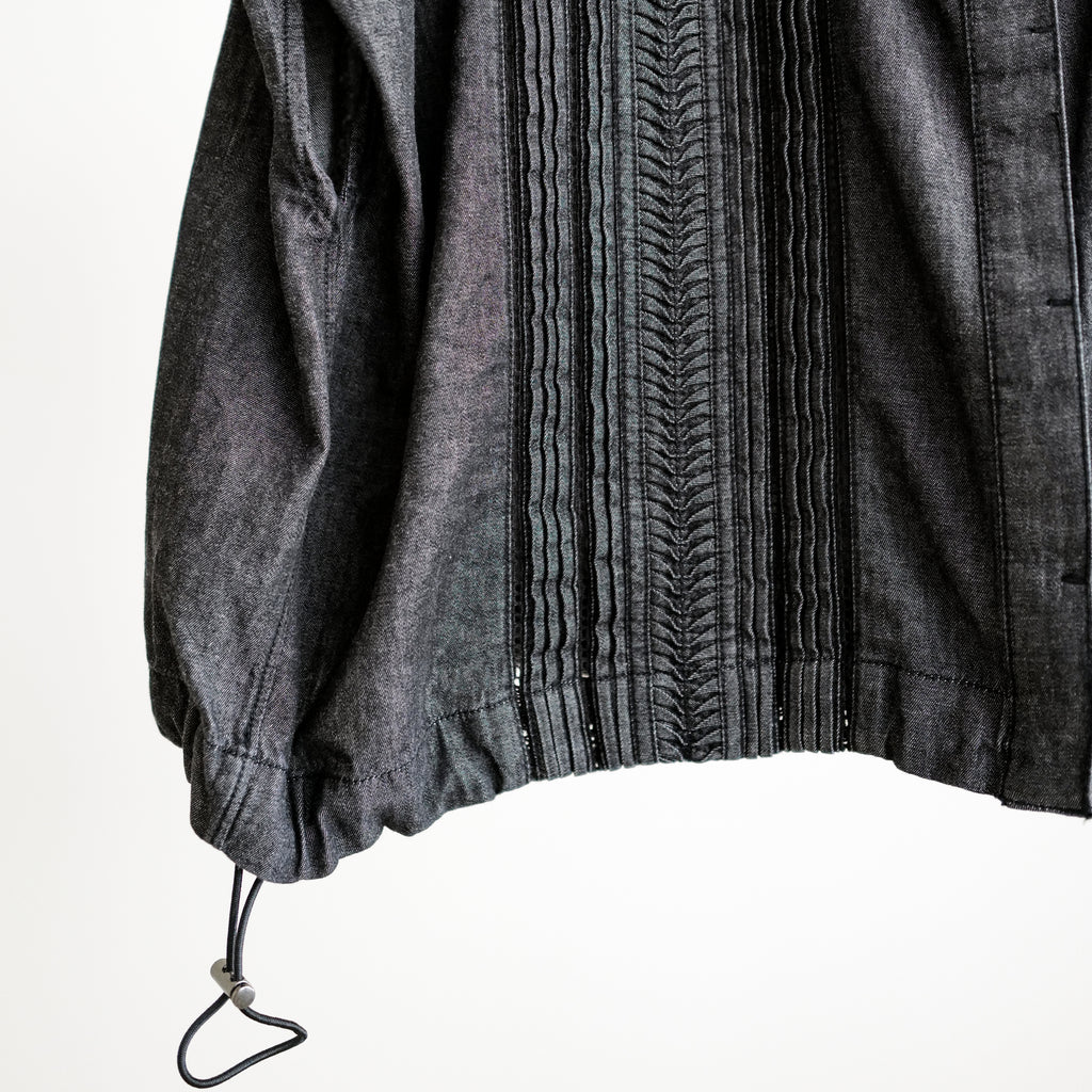 1stコレクションから続く定番シリーズ「Trinity」 ブザムシャツと呼ばれるメンズのドレスシャツを、現代の日常に組み入れたシリーズ 太番手のオーガニックコットンを使用し、製品洗い加工を加えることで、より奥行きのある表情に仕上げた 手仕事による細かなピンタック 着丈を短くカットし、裾にドローコードを配したデザイン