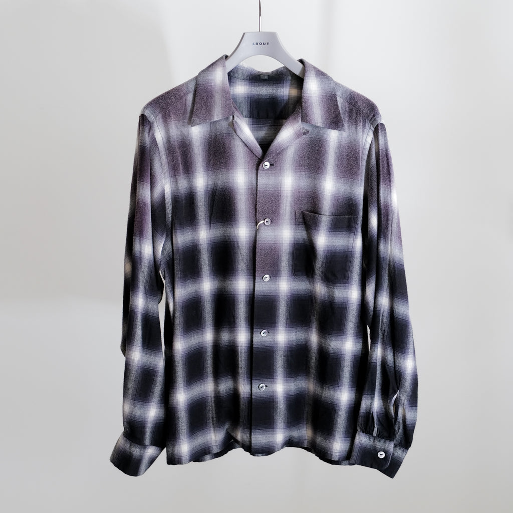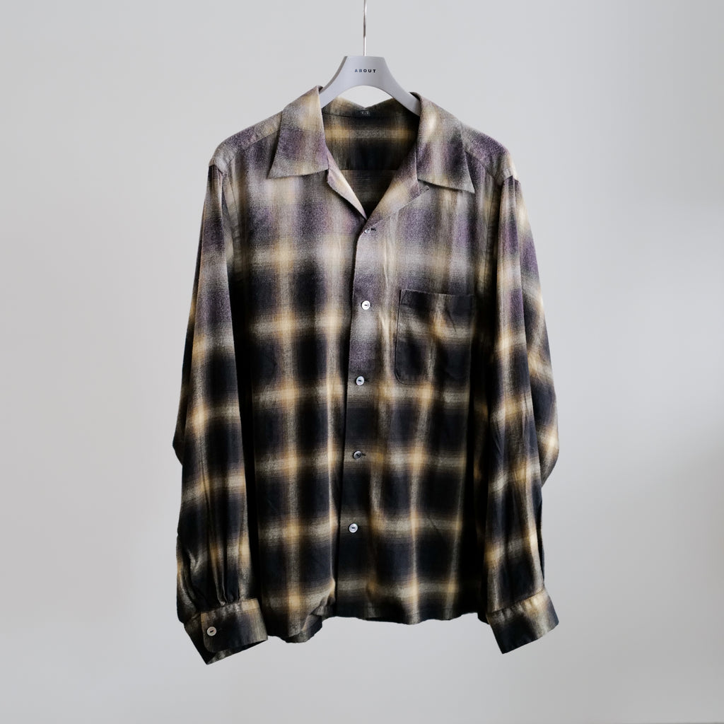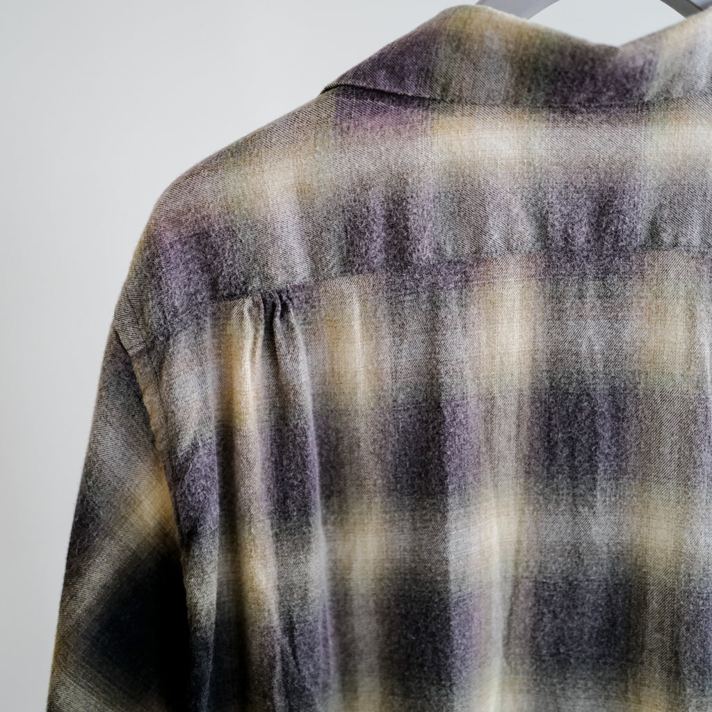 1950年代のアメリカンシャツをベースにしたオープンカラーシャツ レーヨンを混紡したドレープ感のあるオンブレチェック生地 ブリーチ加工によって、古着のような自然な色落ち感を表現