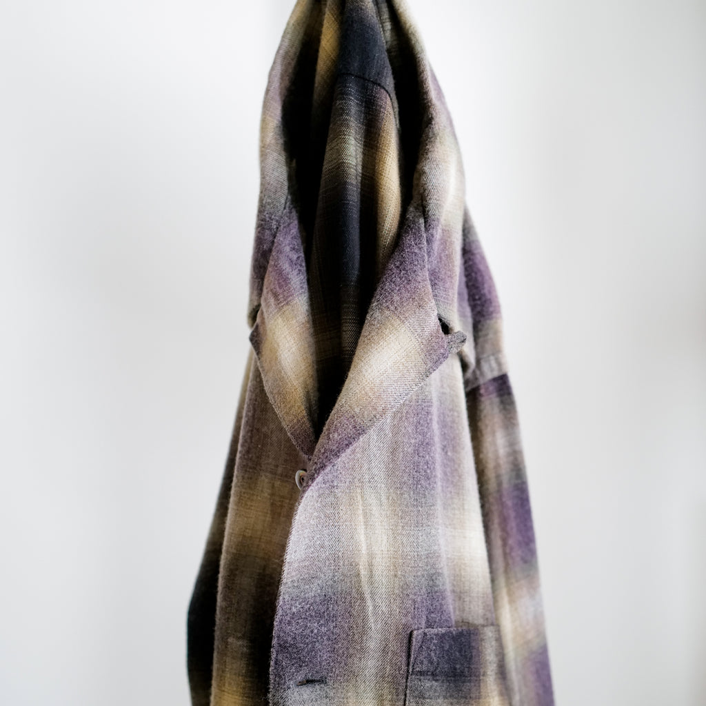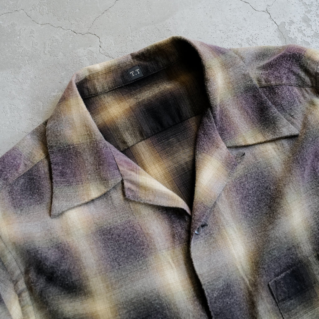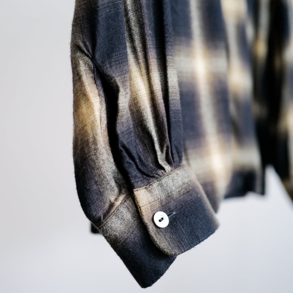 1950年代のアメリカンシャツをベースにしたオープンカラーシャツ レーヨンを混紡したドレープ感のあるオンブレチェック生地 ブリーチ加工によって、古着のような自然な色落ち感を表現