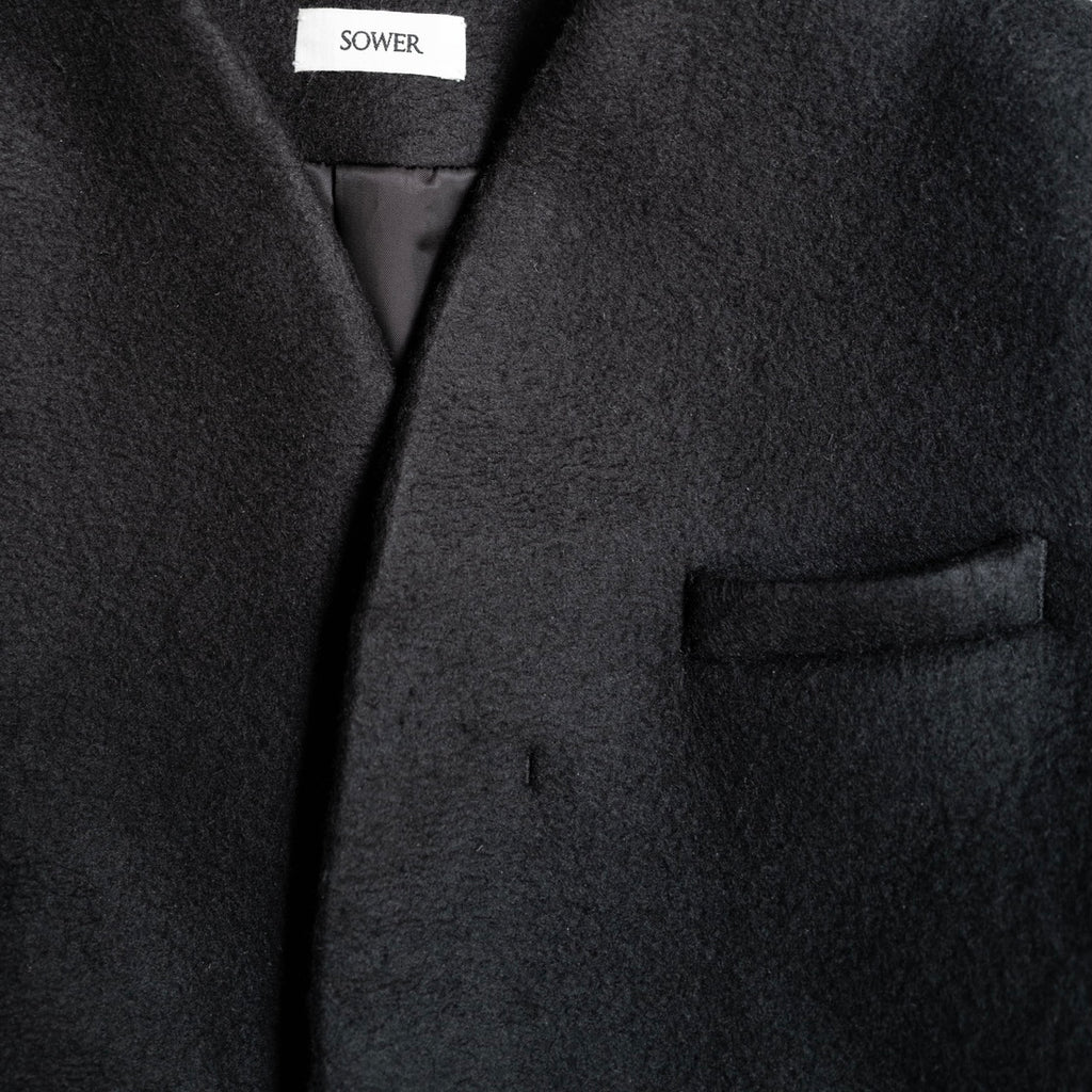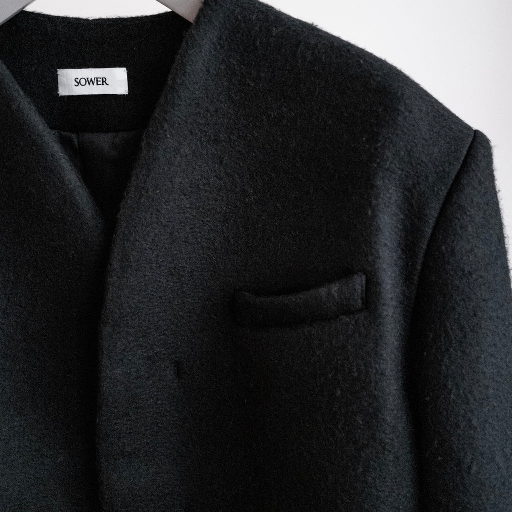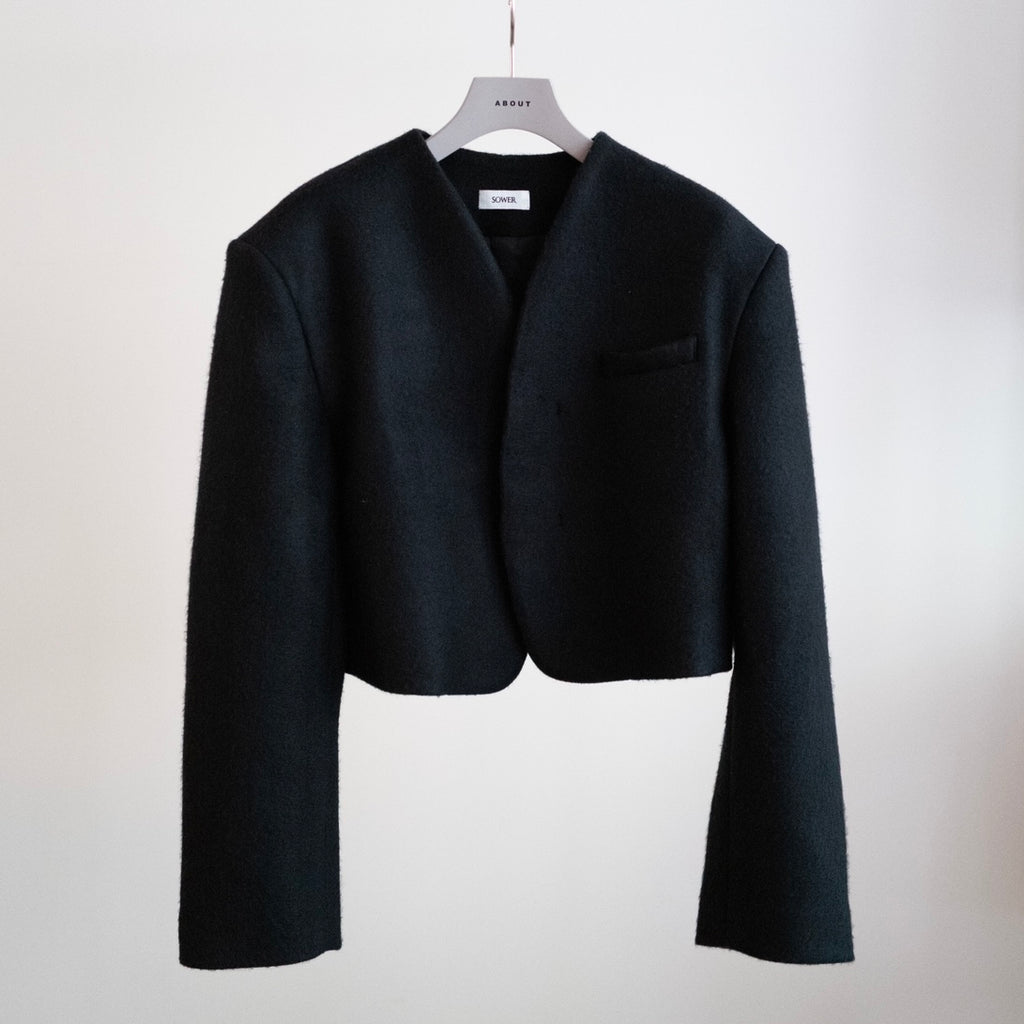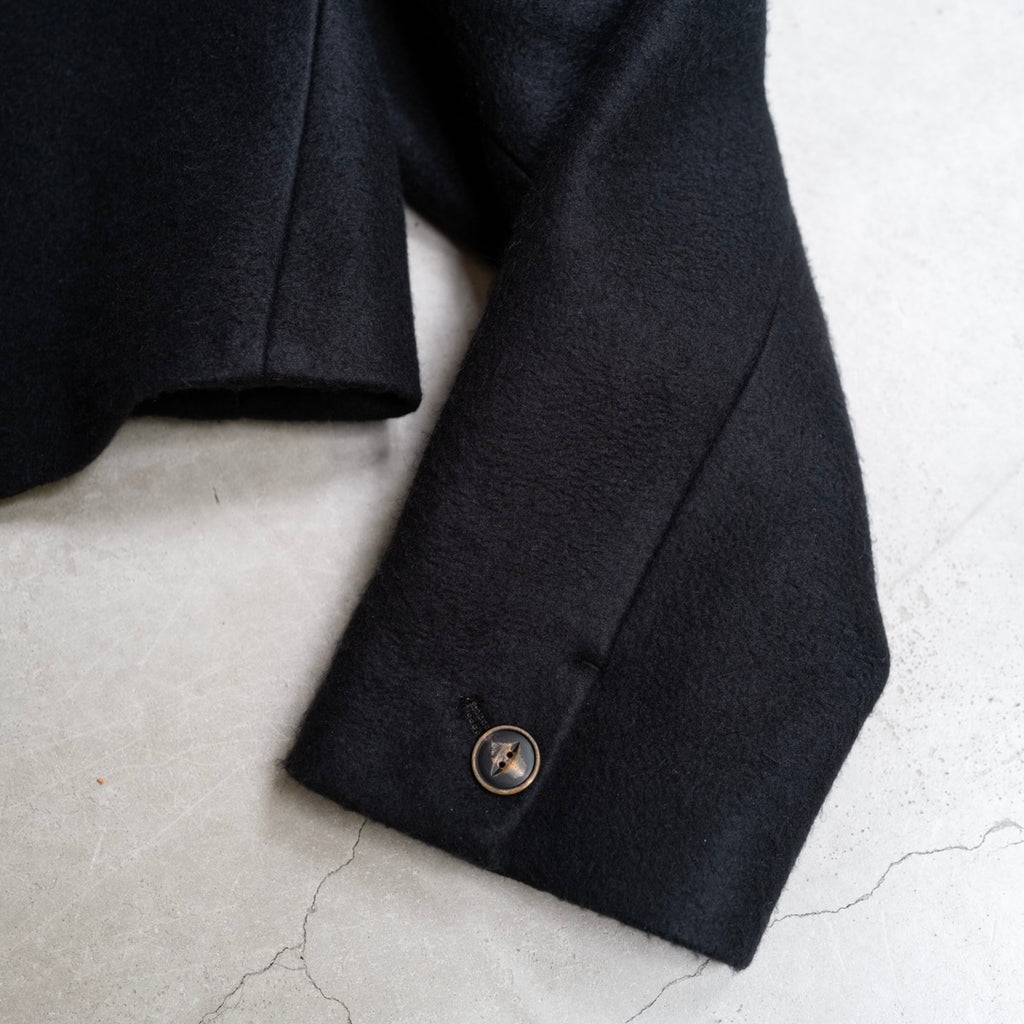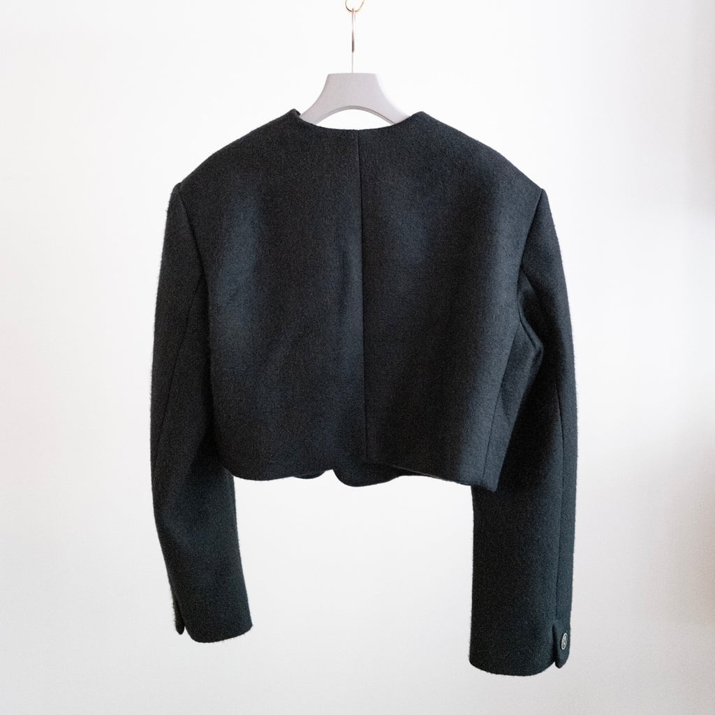 シルクを贅沢に使用したフリース生地 肌に吸い付くような滑らかな肌当たりと上品な光沢 フロントは比翼仕立て、着丈の短いメリハリあるシルエット