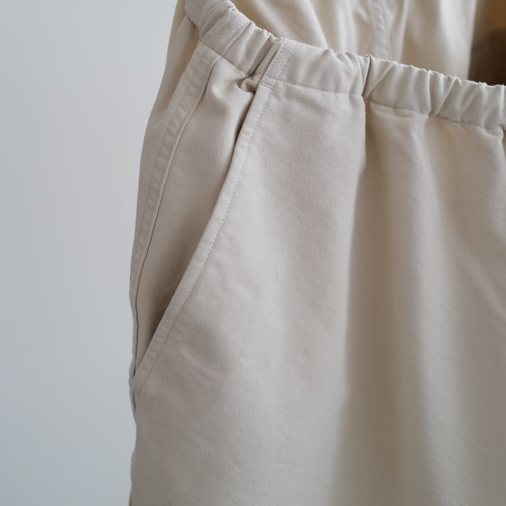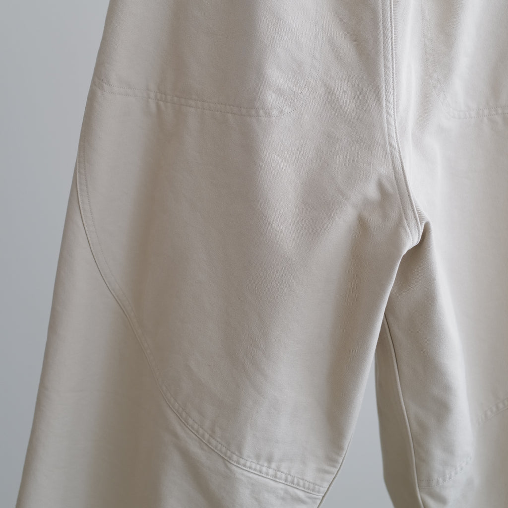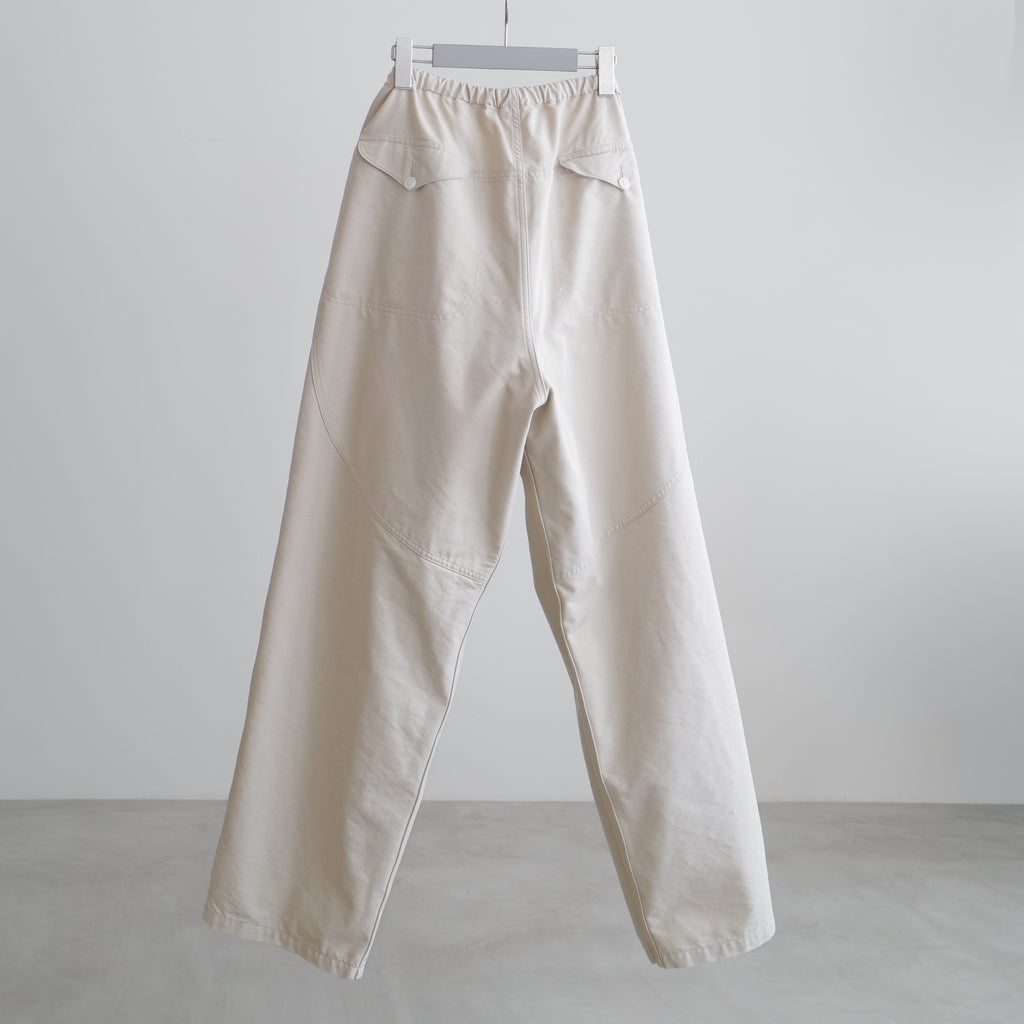ドローストリング仕様のハンティングパンツ コットンをベースにした、ハリ感と柔らかさをもつ生地 ゆったりとしたワイドテーパードシルエット 膝とヒップ周りは生地を2重にしたつくり