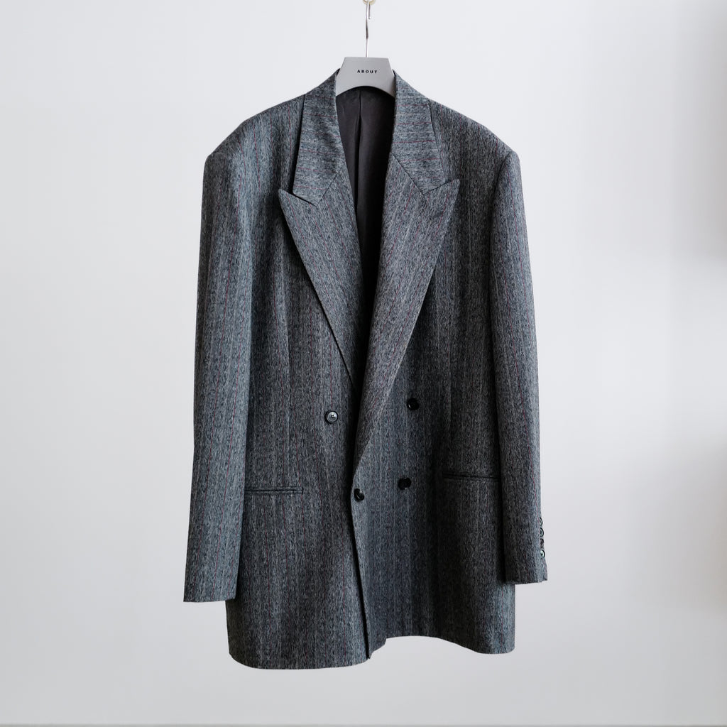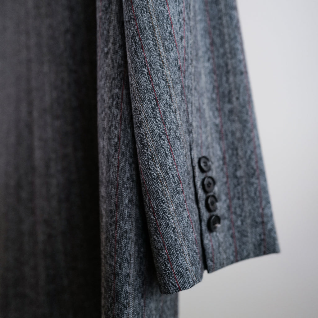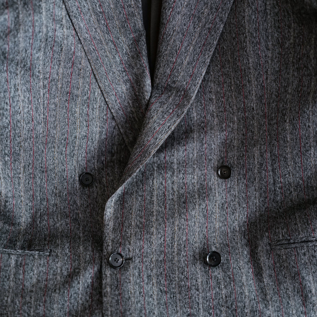 エクストラファインメリノの高級梳毛スーパー130’sを使用したダブルジャケット ゆとりのあるサイズ感に加え、ノンパッドでリラックスショルダー 赤とベージュ糸を使用した上品なピンストライプ