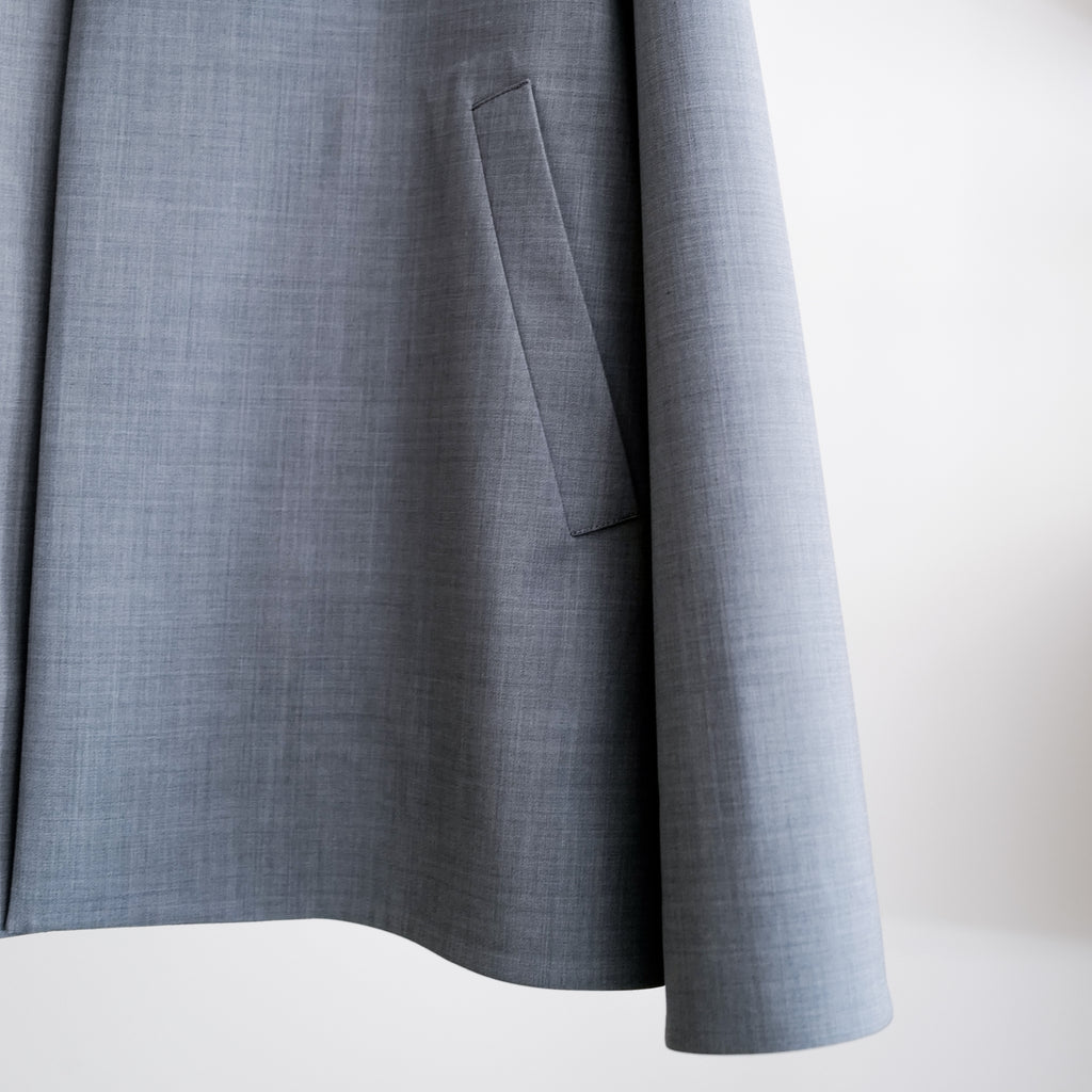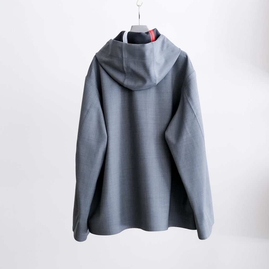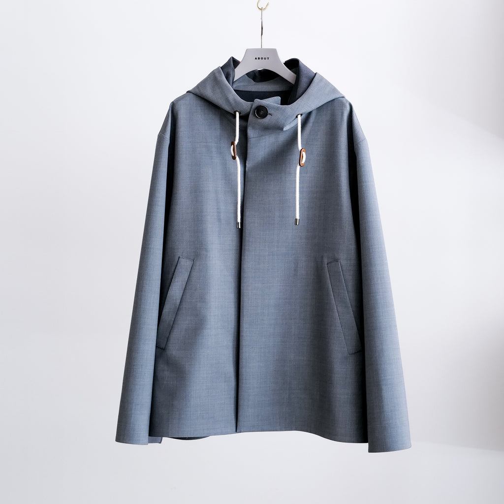 オーバーサイズシルエットのフーデットコート 光沢があり、滑らかな肌触りのウール糸を生地にして張り合わせた、ボンディング生地を使用 裏地のシーム部分には配色の止水テープが施されており、随所に拘りを感じることができる1着 リバーシブルでの着用が可能