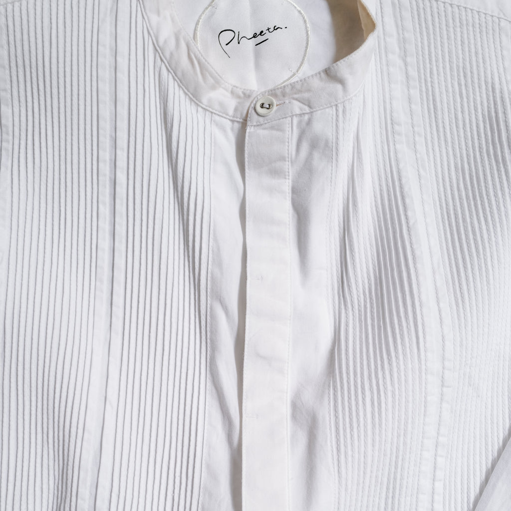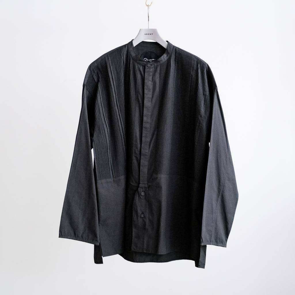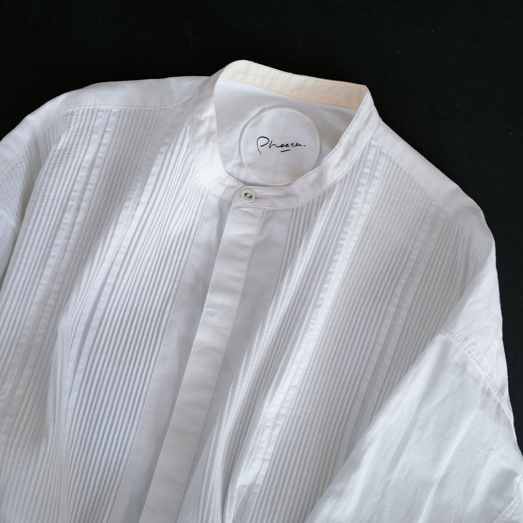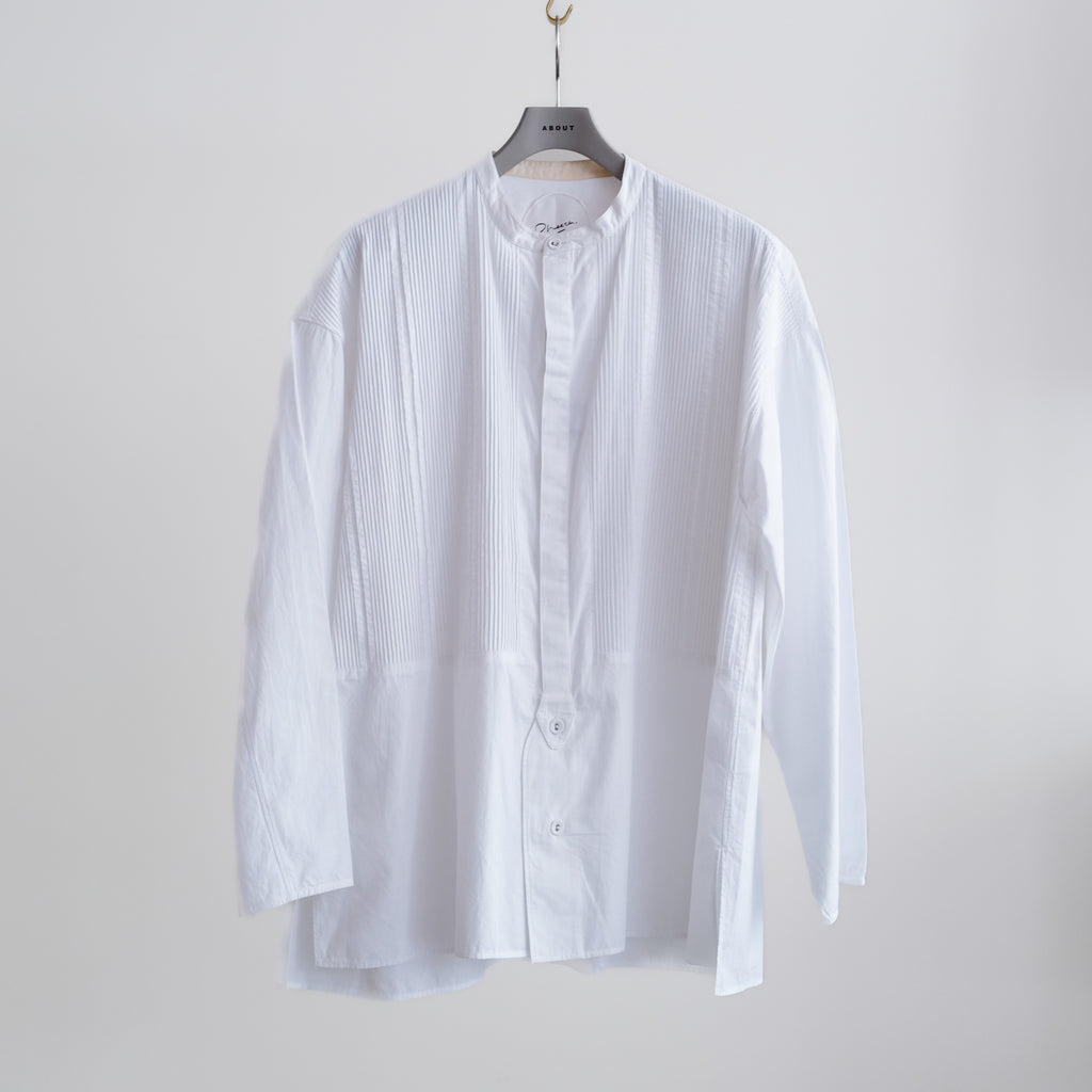 1stコレクションから続く定番シリーズ「Trinity」 ブザムシャツと呼ばれるメンズのドレスシャツを、現代の日常に組み入れたシリーズ 太番手のオーガニックコットンを使用し、製品洗い加工を加えることで、より奥行きのある表情に仕上げた 手仕事による細かなピンタックが特徴