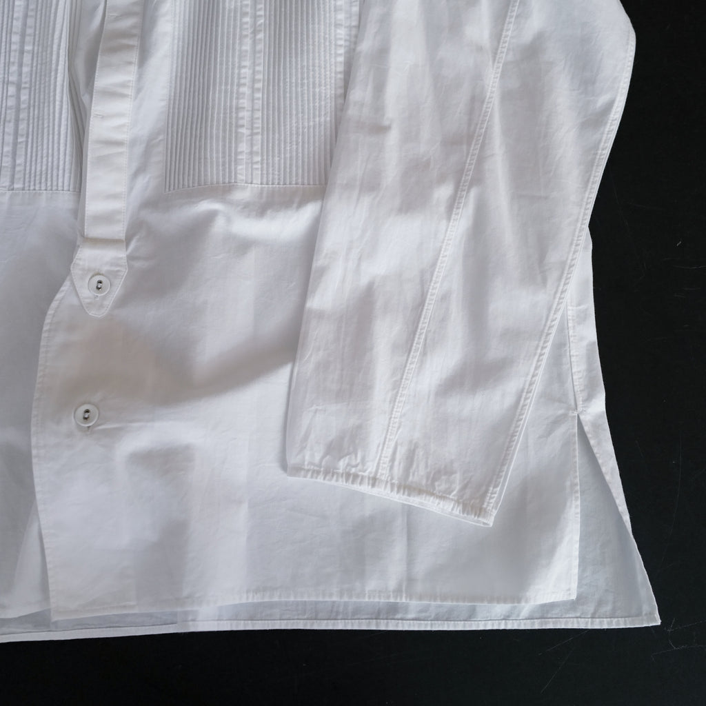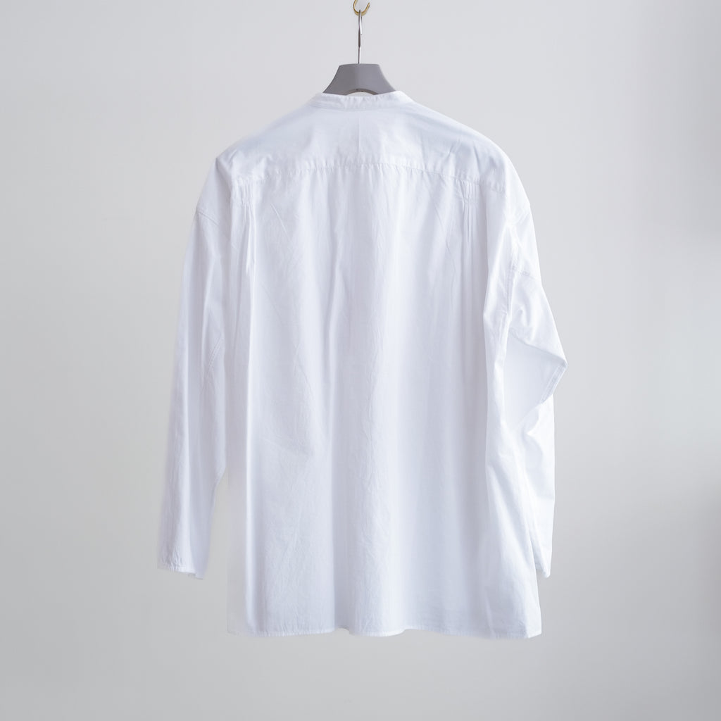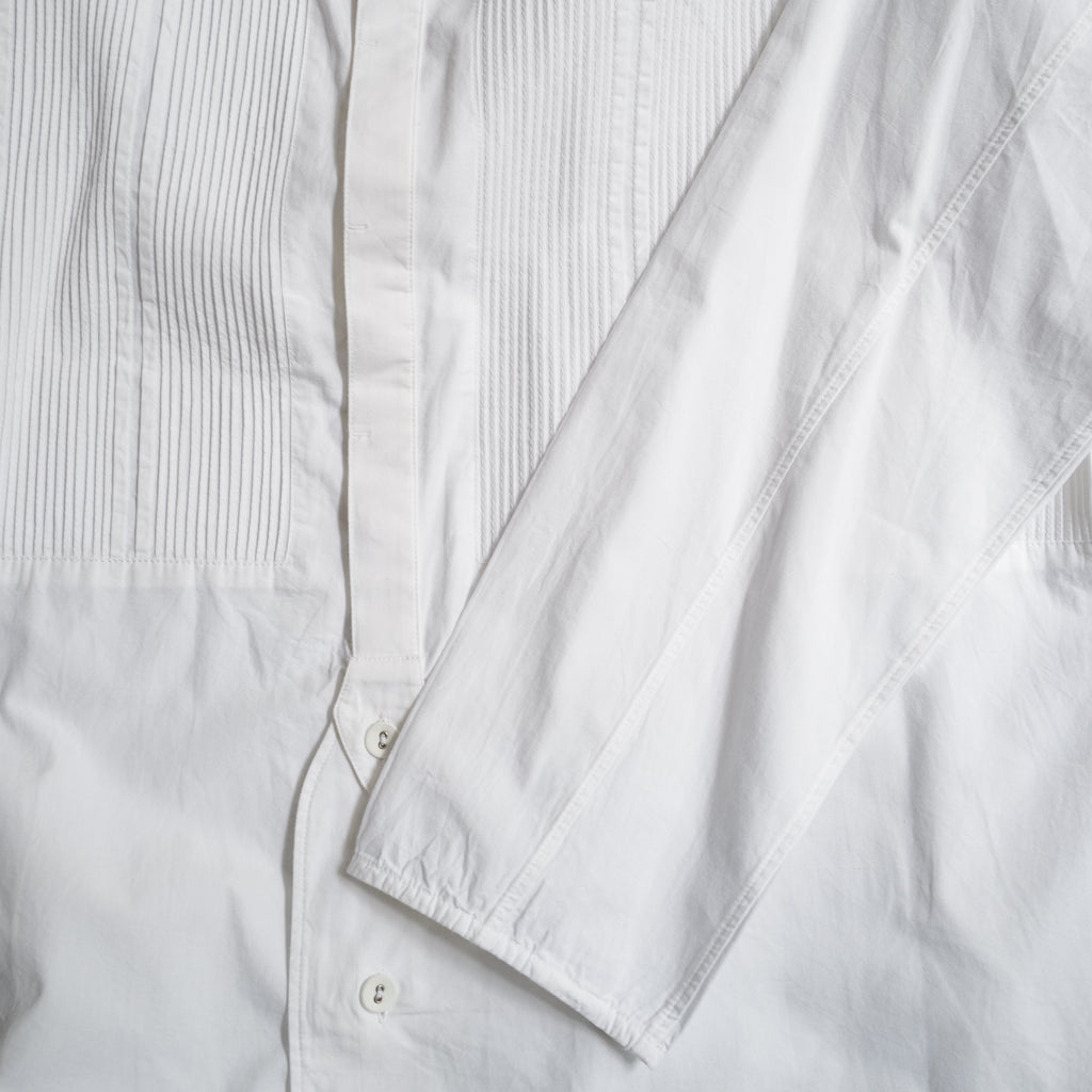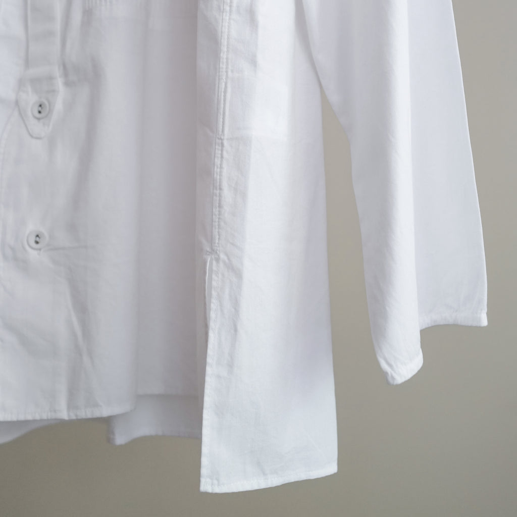 1stコレクションから続く定番シリーズ「Trinity」 ブザムシャツと呼ばれるメンズのドレスシャツを、現代の日常に組み入れたシリーズ 太番手のオーガニックコットンを使用し、製品洗い加工を加えることで、より奥行きのある表情に仕上げた 手仕事による細かなピンタックが特徴