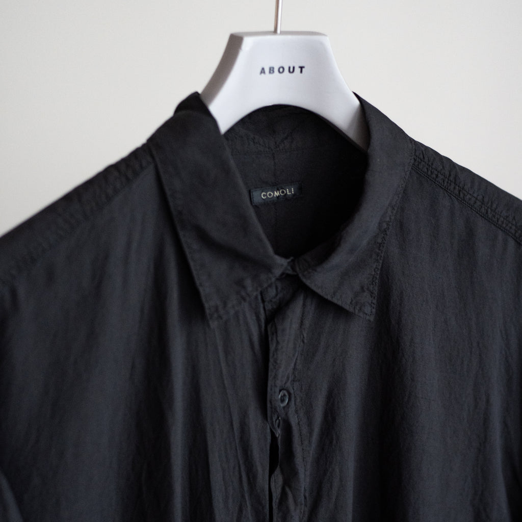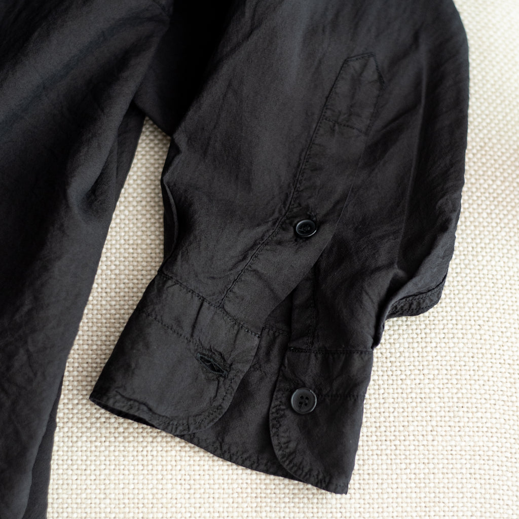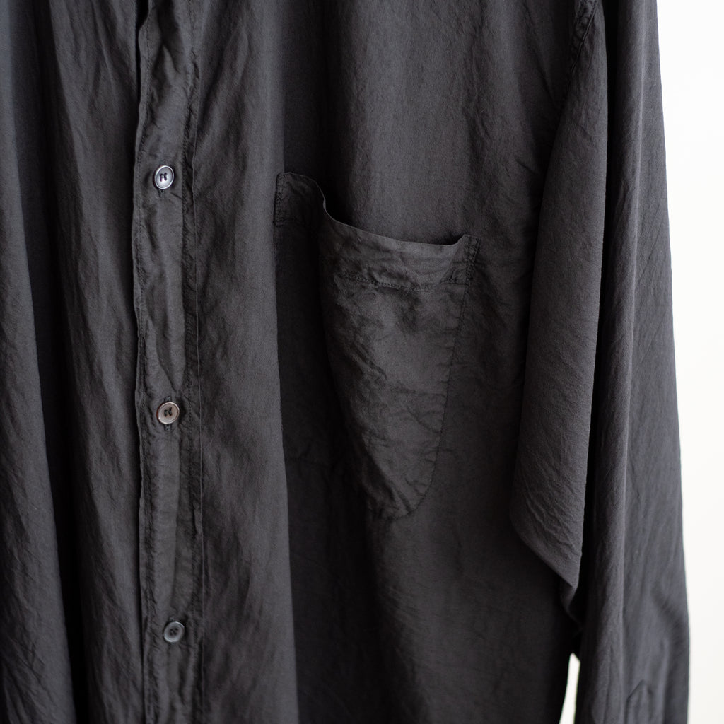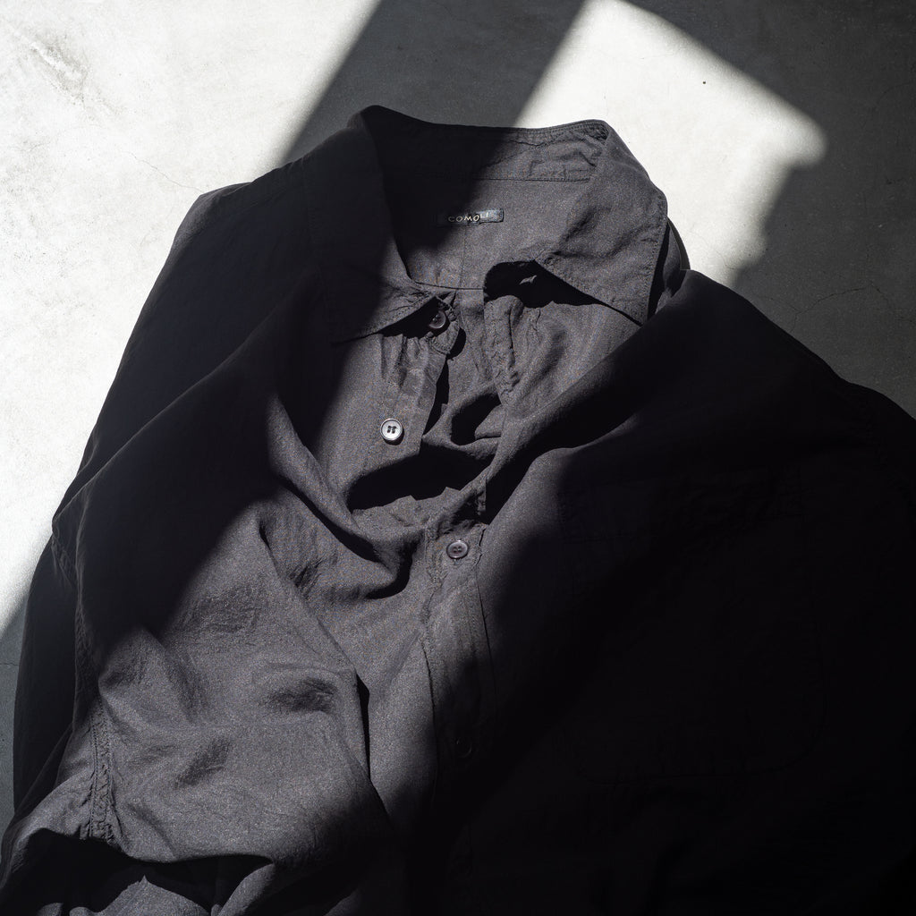 製品染め加工を施したシルク100%のシャツ ややすっきりとした身幅と、長めの着丈でリラックスした印象 製品染め特有の奥行きある生地感と、ドライタッチな肌当たりが特徴