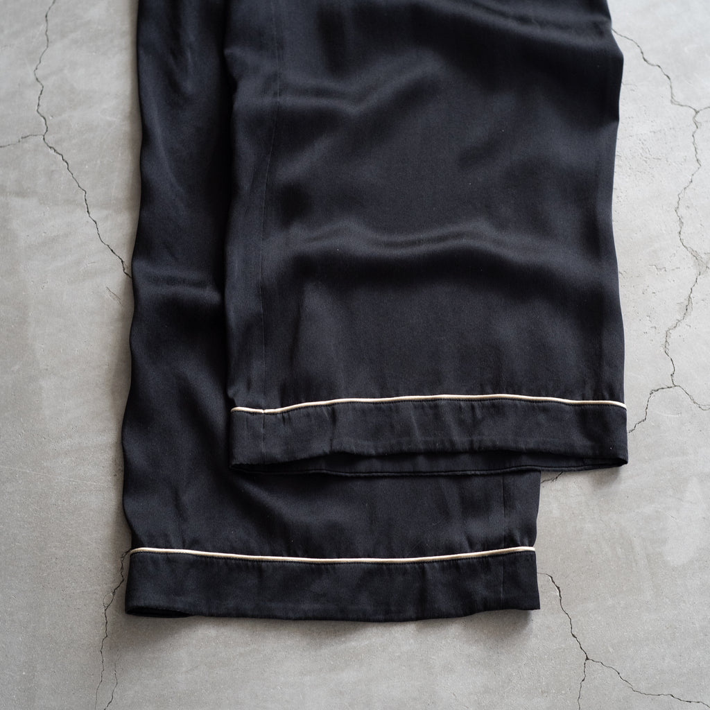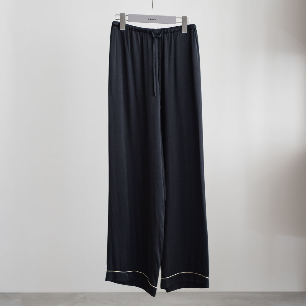 シルク素材のパジャマパンツ パジャマパンツらしいゆとりのあるシルエットとパイピングが特徴 共生地のパジャマシャツとあわせての着用もおすすめ