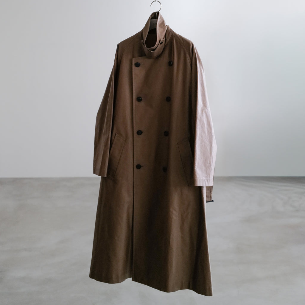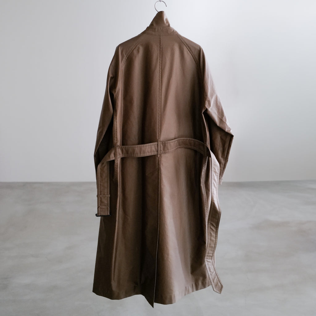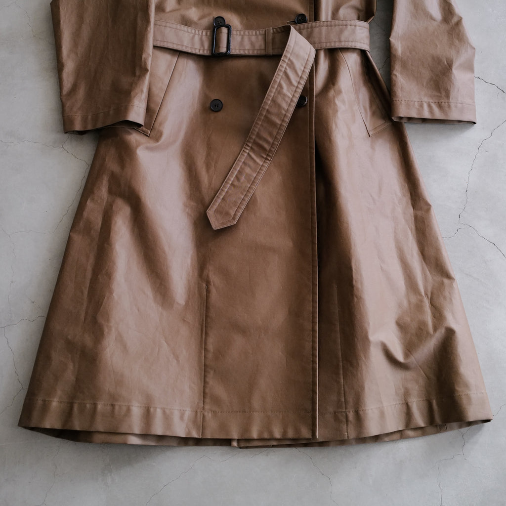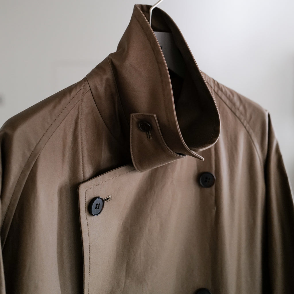 オーバーサイズのトレンチコート 高密度に織り上げたコットン生地に、ポリウレタコーティングを施すことで独特のハリと光沢を実現 背面には深めのセンターベント、ウエストベルト付き