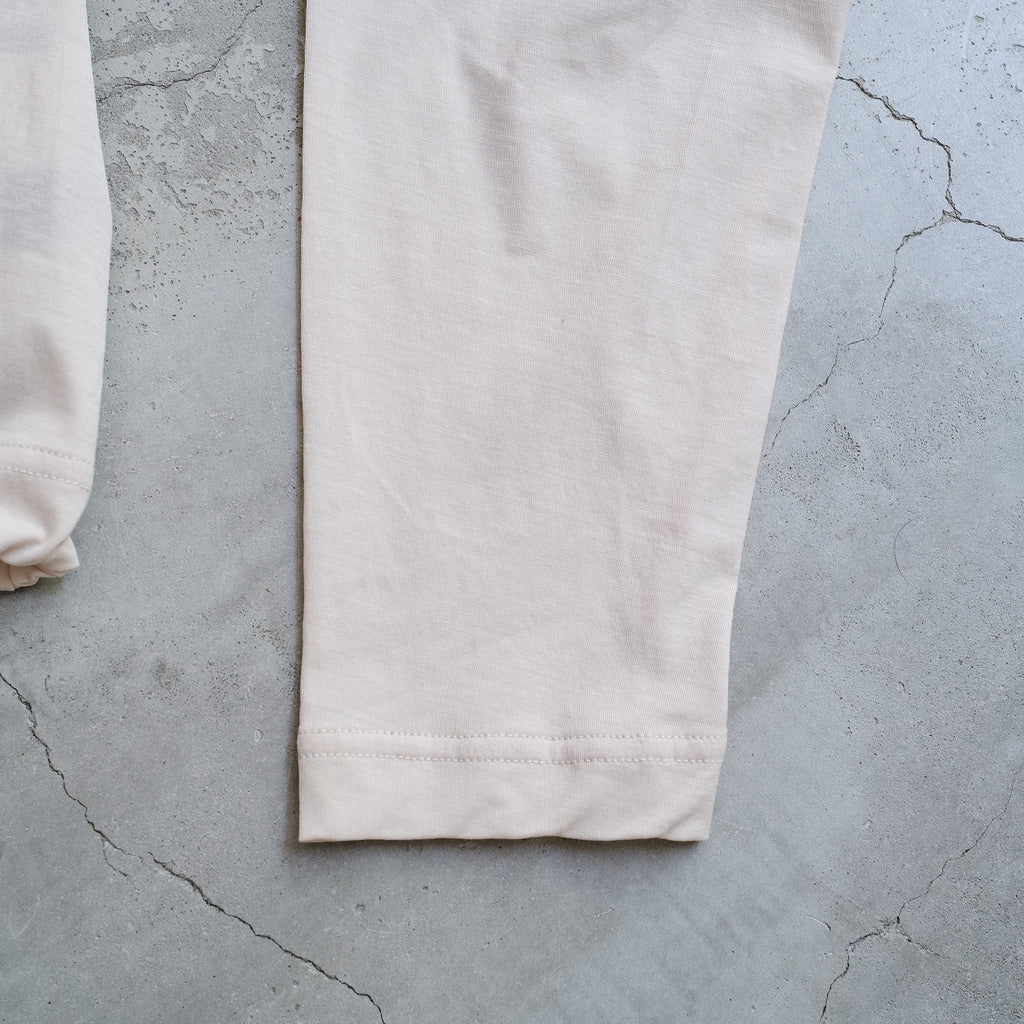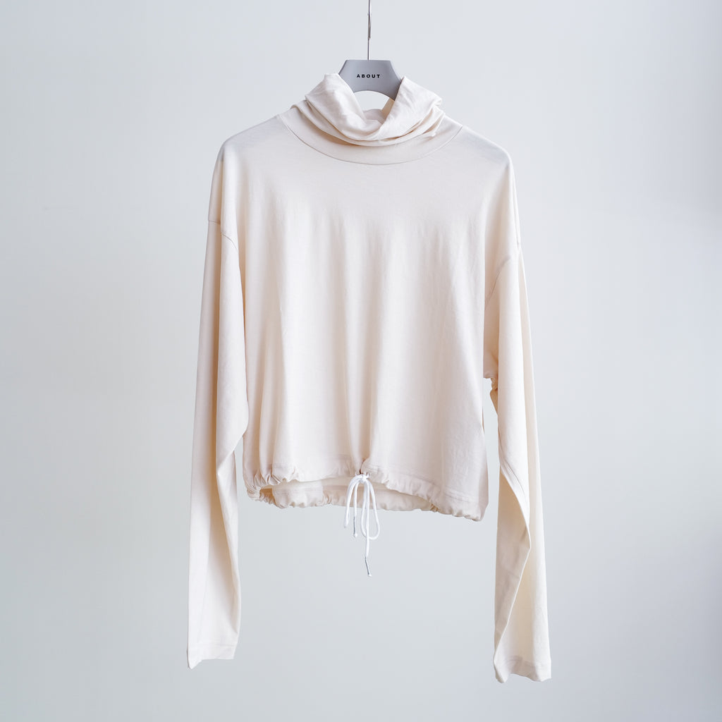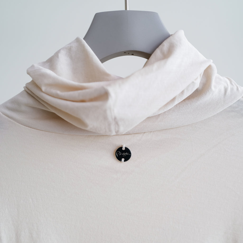 着心地の良さを追及したカットソーシリーズ``Emmy`` 超長綿の110番手という、とても細い綿糸にシルケット加工を施した生地を使用 糸の繊細さに起因する、生地が一方方向にねじれる現象を利用して、デザインとして取り入れたねじれのネック シルクのような柔らかな光沢と風合い