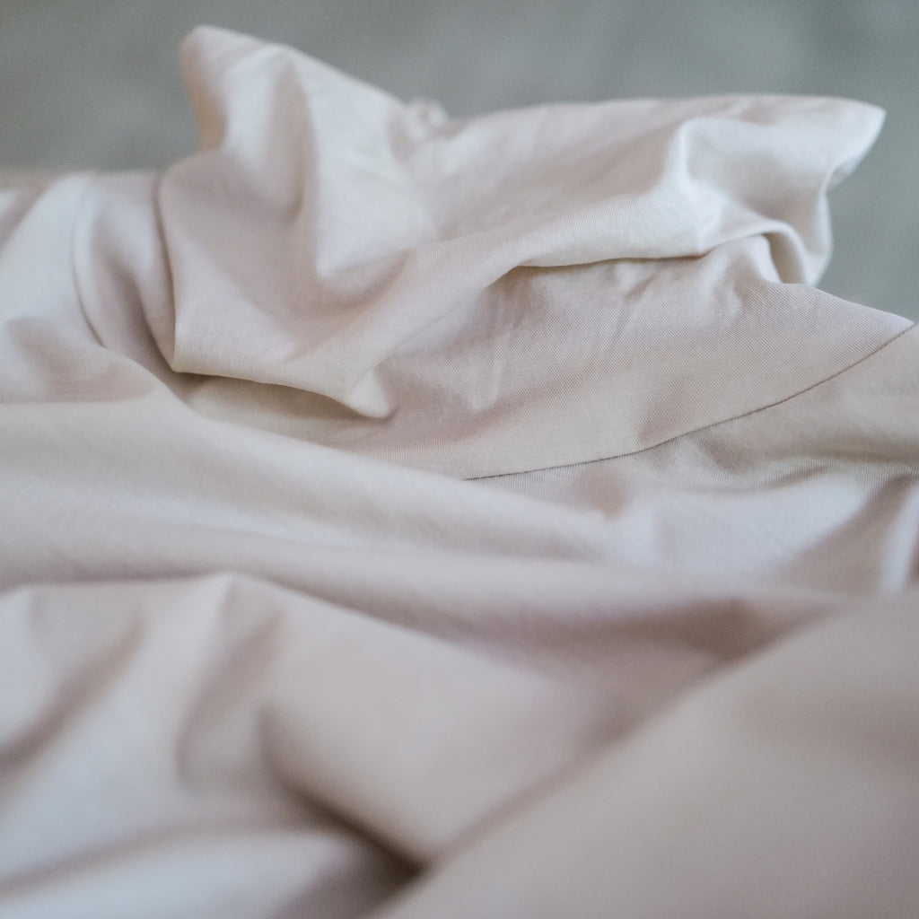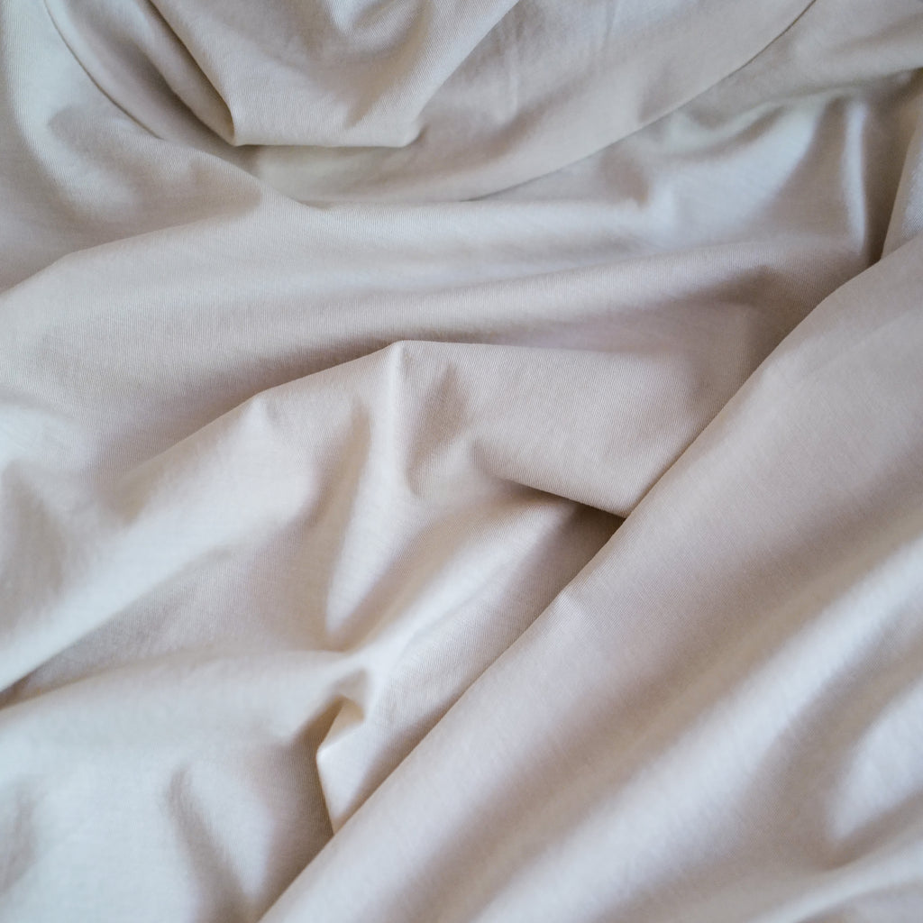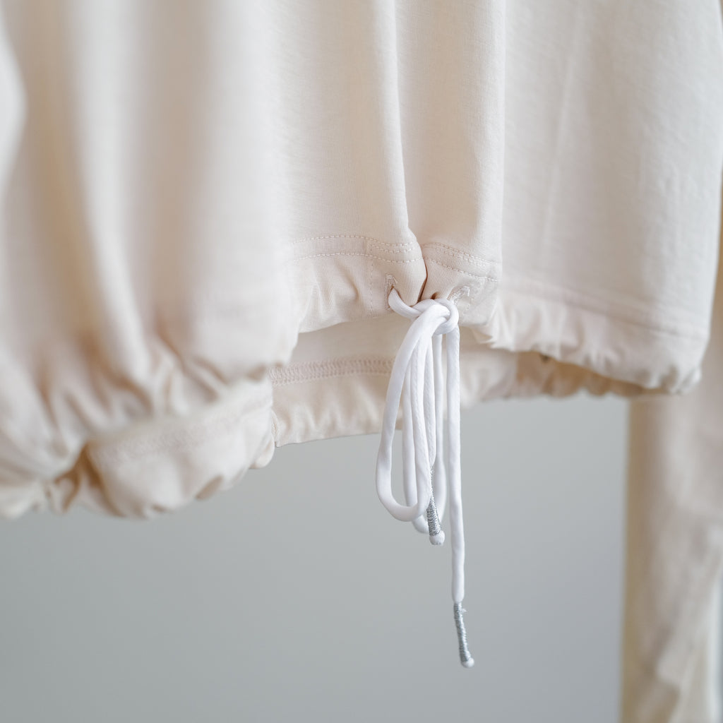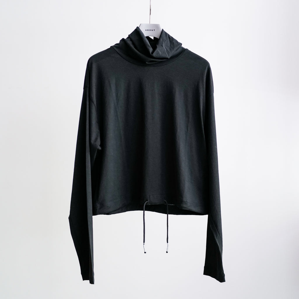 着心地の良さを追及したカットソーシリーズ``Emmy`` 超長綿の110番手という、とても細い綿糸にシルケット加工を施した生地を使用 糸の繊細さに起因する、生地が一方方向にねじれる現象を利用して、デザインとして取り入れたねじれのネック シルクのような柔らかな光沢と風合い