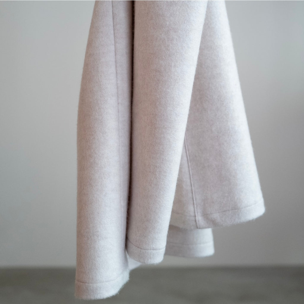 シルクを贅沢に使用したフリース生地 肌に吸い付くような滑らかな肌当たりと上品な光沢 裾にかけてフレアするエレガントなシルエット
